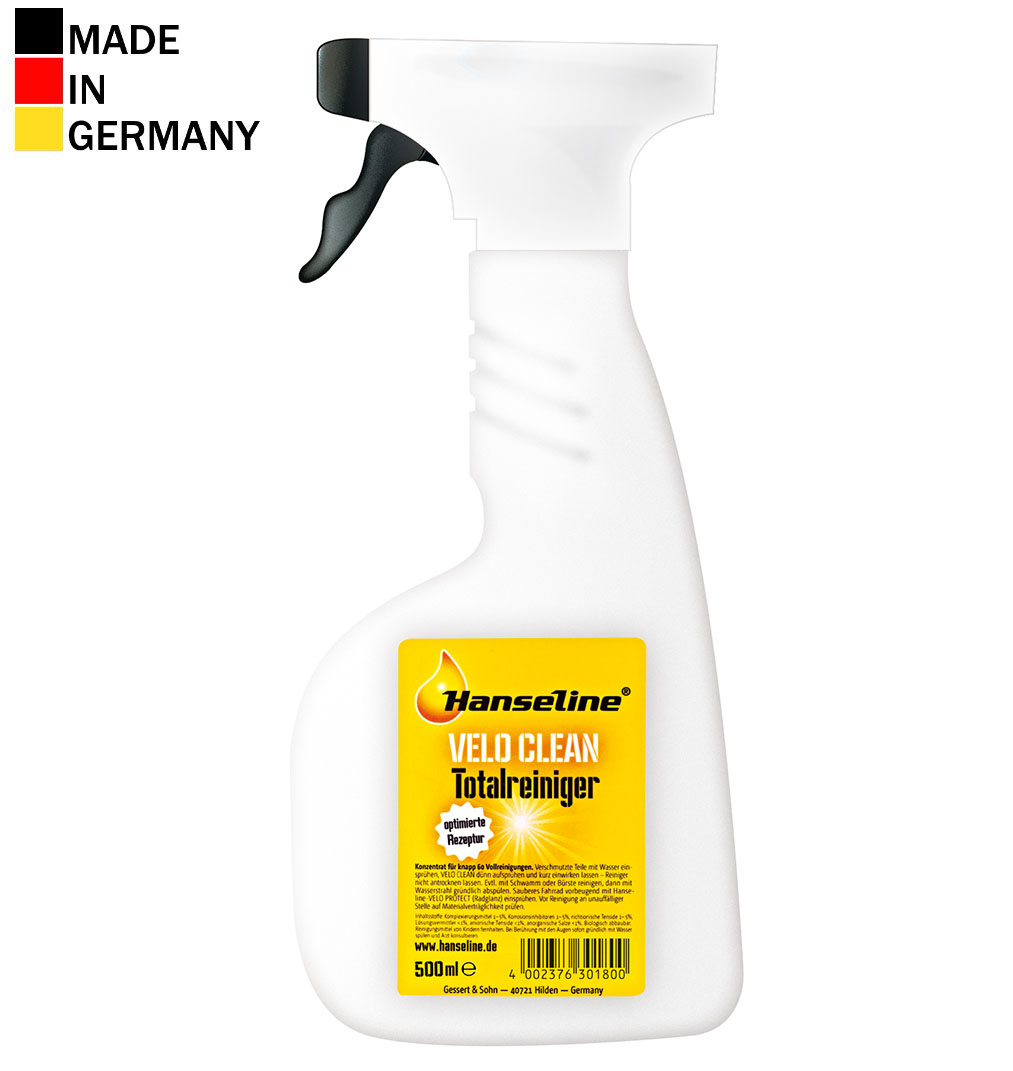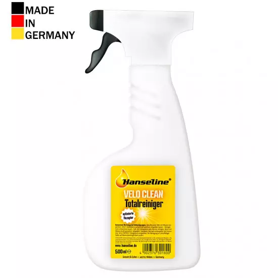 HANSELINE - pure biking! The brand, which is known for tradition and quality. Individual products for every purpose.Hanseline VELO-CLEAN Total Bike is universal cleaner for whole bicycle, based on different active wash substances and complex agentsThanks to excellent degreasing qualities it removes all road grit and dirt from your bike effectively Contains corrosion inhibitors.Does not harm sensitive plastic and rubber partsBiodegradableThe spray head works only at certain minimum pressure - when pressure is too low head closes automatically to avoid wasting the liquidUsageThe foam is ready for use. Protective gloves should be worn. Spray the foam onto the desired surface from a distance of approx. 15 cm. Wait for a few moments and wipe the sprayed area with a damp sponge or a soft brush, then rinse the bike with water. Repeat the process if necessary. Do not apply the foam to hot surfaces and do not let it dry anywhere on the bike. Every time you use the foam, rinse the cleaned surface with water. Take proper care. Do not add any solvents. Does not contain phosphates and is not harmful to the environment. Prior to usage please try the product on a less visible part of the bike. Do not use in direct sunlight and do not let the foam dry on the surface being cleaned. TYPE: liquidCAPACITY: 500ml bottle with spray headMade in Germanywww.hanseline.de