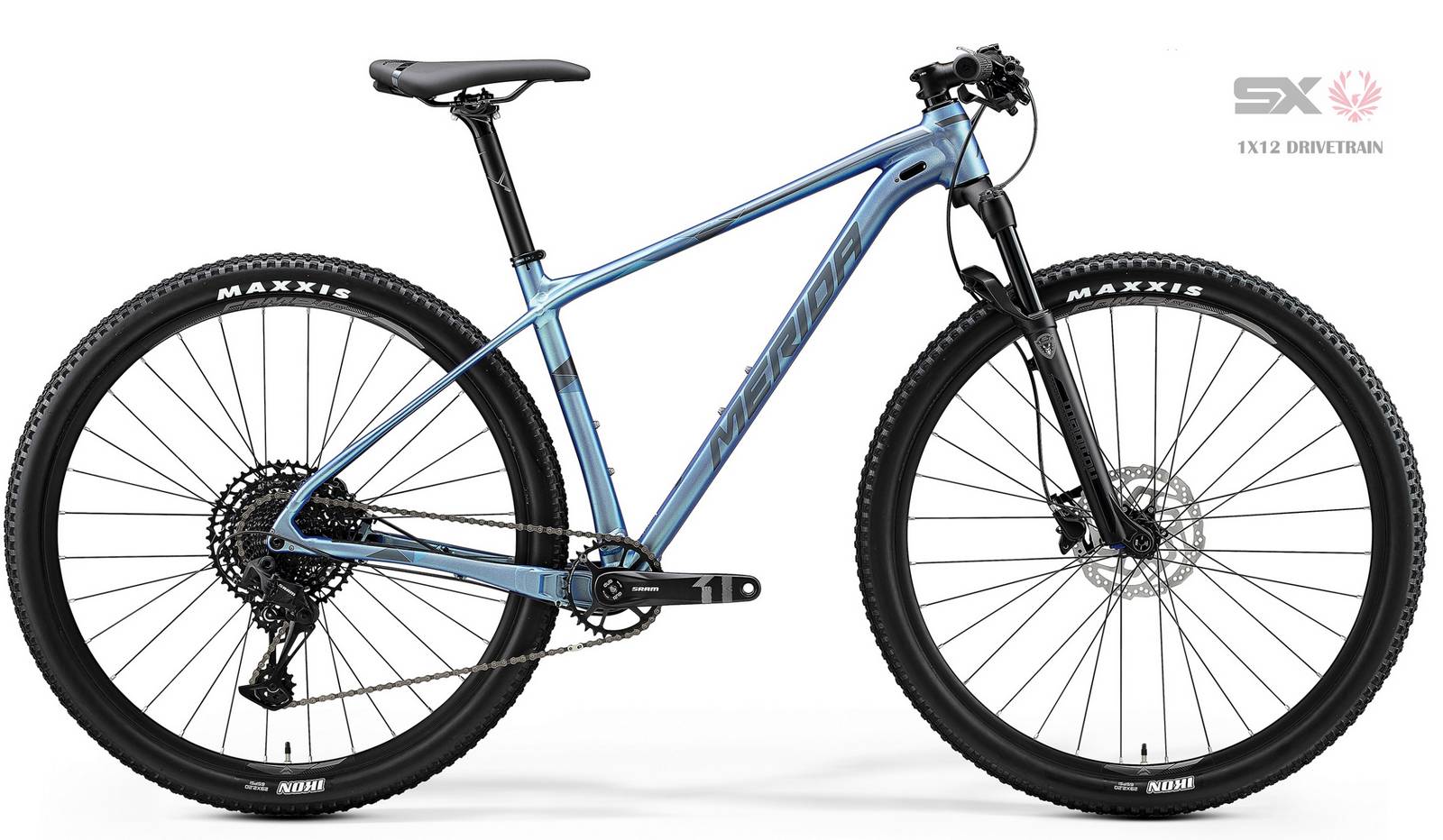 FRAME: BIG.NINE LITE Aluminium, Hydro Forming System, Flex Stay, X-Taper Headtube, Smooth Welding, Internal cable routing, Down Tube Exit, Smart Entry, Di2 readyFORK: Manitou Markhor Comp, air, 100mm suspension travel, tapered, remote lockout, 51mm offsetBRAKES: Shimano MT-200, 2 pistonBOTTOM BRACKET: Sram BB DUB PF MTB 92CHAIN: Sram SX EagleCHAINWHEEL: Sram X11000 Eagle, 32 teethREAR DERAILLEUR: Sram SX EagleFREEWHEEL: Sram PG-1210 Eagle, 11-50 teeth, 12 speedHANDLEBAR: Merida Expert CC, 720mm width, flatSTEM: Merida Expert CC, 31.8mm diameter, -6° stem angle, S-70 mm, M-80 mm, L-90 mm, XL-100 mm, XXL-110 mmHEADSET: MERIDA M2331HUBS: Front: Shimano MT400-B, 110x15mm Thru axle, 32 spoke holes, centerlockRear: Shimano MT400-B, 148x12mm Thru axle, 32 spoke holes, centerlockPEDALS: NOT INCLUDEDRIMS: MERIDA COMP CC, 20mm inner widthSADDLE: MERIDA COMP CCSEAT POST: MERIDA COMP CC, 30.9mm diameterSHIFTERS: Sram SX EagleSPOKES: Black stainlessTYRES: Maxxis Ikon, 29x2.2", foldableWEIGHT: 12.16 kgSPEEDS: 12GRIPS: MERIDA COMP ECBRAKE DISCS: Front: Shimano RT10, 180mmRear: Shimano RT10, 160mm