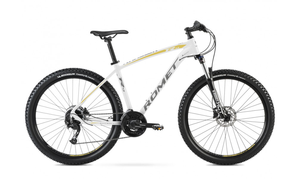 Raam: Aluminium 6061Kahvel: SR Suntour XCT DS. HLOKäikude arv: 24 speedKäiguvahetaja kangid: Shimano ST-EF505 3 speed / Shimano ST-EF505 8 speedEesmine käiguvahetaja: Shimano Tourney TY700Tagumine käiguvahetaja: Shimano Acera RD-M3100 SGS ShadowVändad : 42/34/24T 170 mmPidurid: Shimano BL-MT200/BR-MT200 hydraulicPidurikettad: Shimano SM-RT10 centerlock 160 mmRehvid: 27.5 x 2.10 (54-584)Veljed: aluminium doublewallRummud: Front: Shimano AHBTX505 centerlock QR / Rear: Shimano FH-TX5058 centerlock QRTirr: Shimano HG31-8 11-34T 8 speedJuhtraud: Romet aluminium 720 mm 15' FOVLenksupikendus: Romet aluminium 90 mmSadulapost: Romet aluminium 31,6 mm 350 mmSadul: RometPedaalid: FP-971 aluminiumKaal: 15,6 kg