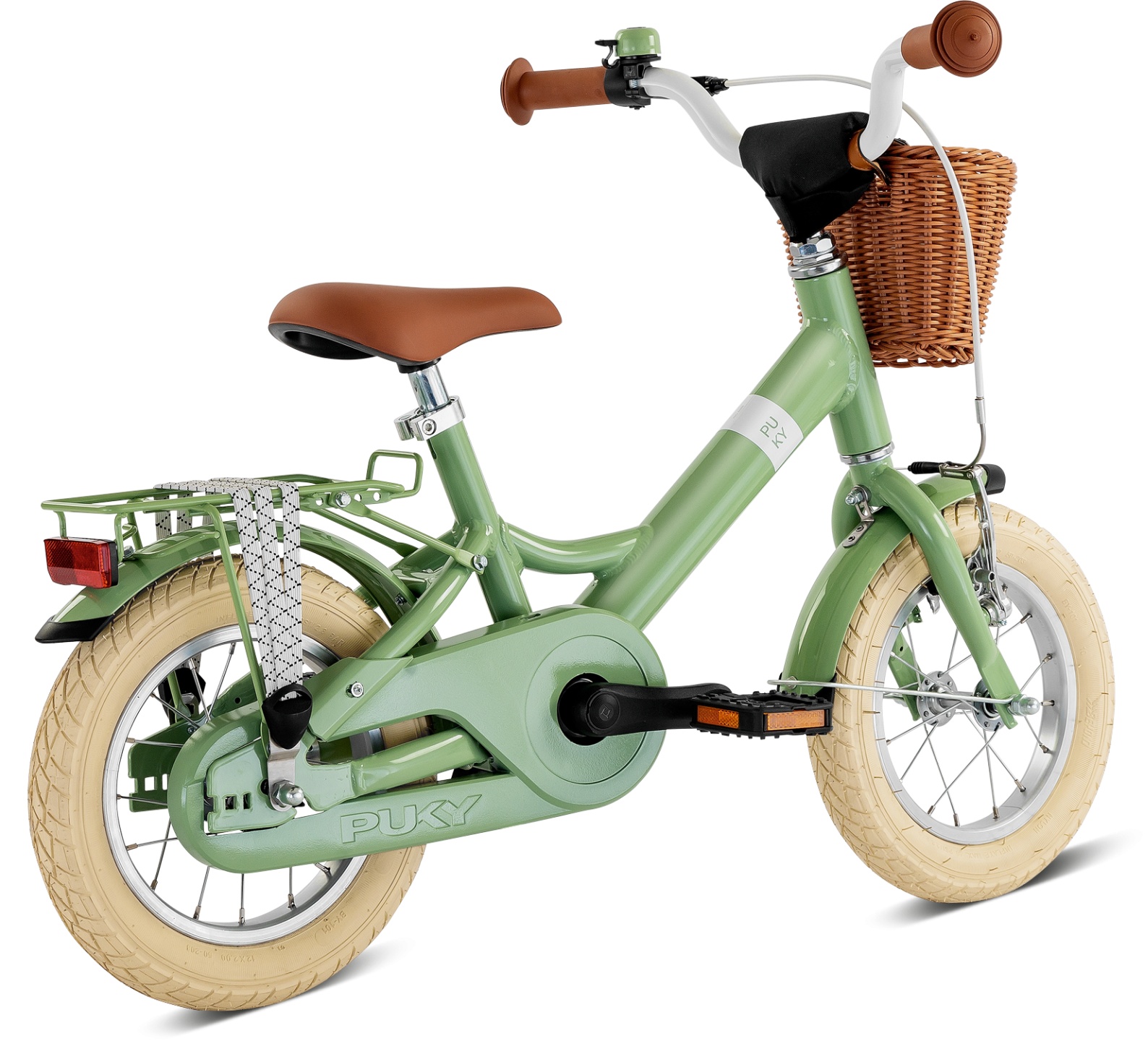 The PUKY Safety Set, consisting of handlebar pad, bell, safety handlebar grips, closed chain case and side stand, provides additional safety and practical features. The frame's durable powder coating ensures a long-lasting appearance and protection against corrosion.
