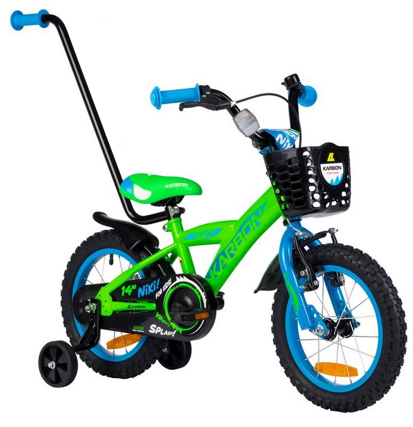 - Lisavarustus: front basket, pushing rod, flag, training wheels, full chainguard, bell, spoke reflectors