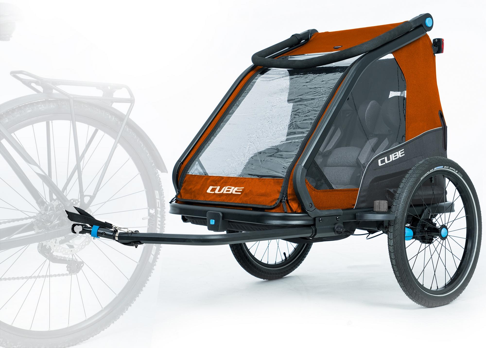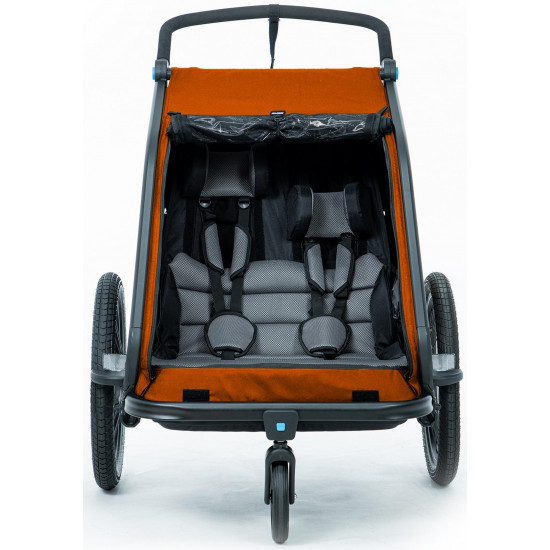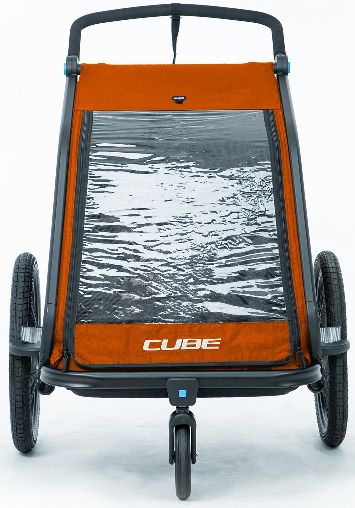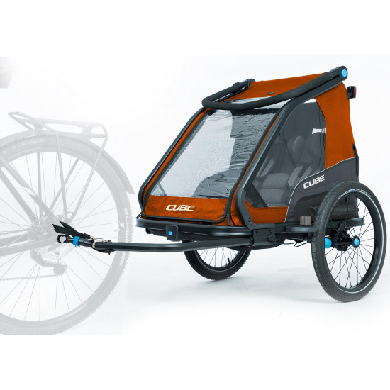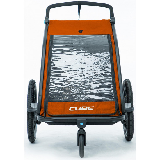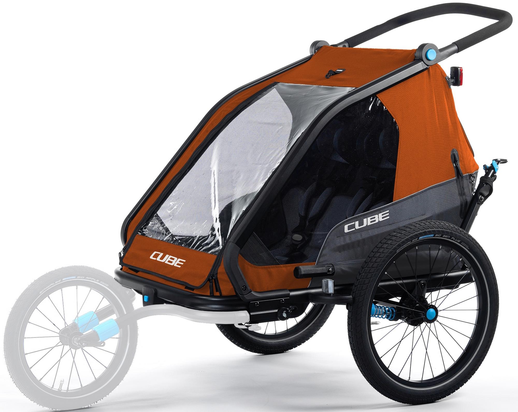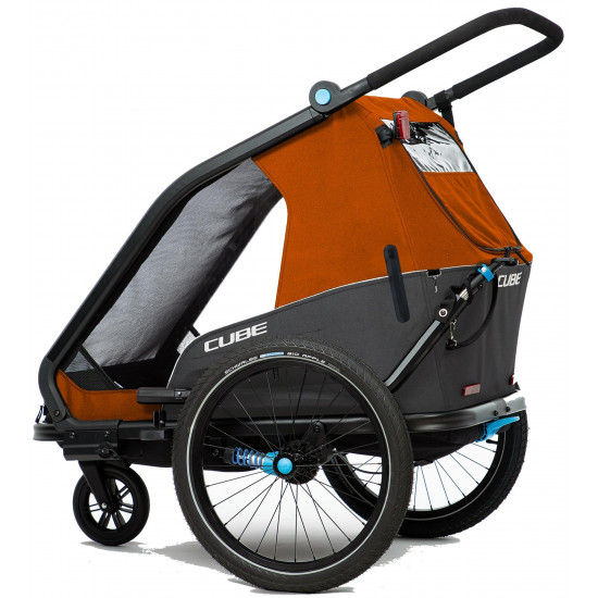 The cube kids trailer double cmpt is the perfect everyday companion. This sophisticated multi-talent is a bike trailer and kids' buggy in one. A large insect net extending across the front and sides keeps the bugs out without affecting the circulation of fresh air. Kids can nap in peace courtesy of the sun shade to protect against the bright light. The splash protection means you can keep riding even when it's muddy and wet outside while the kids stay dry. Seat and back padding and a headrest with helmet pocket make sure the little ones ride in comfort. Individually adjustable suspension can be adapted to the terrain and loading weight. For even more flexibility, the trailer is compatible with the jogger kit (available separately).