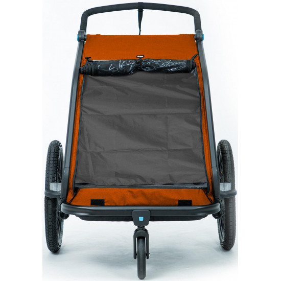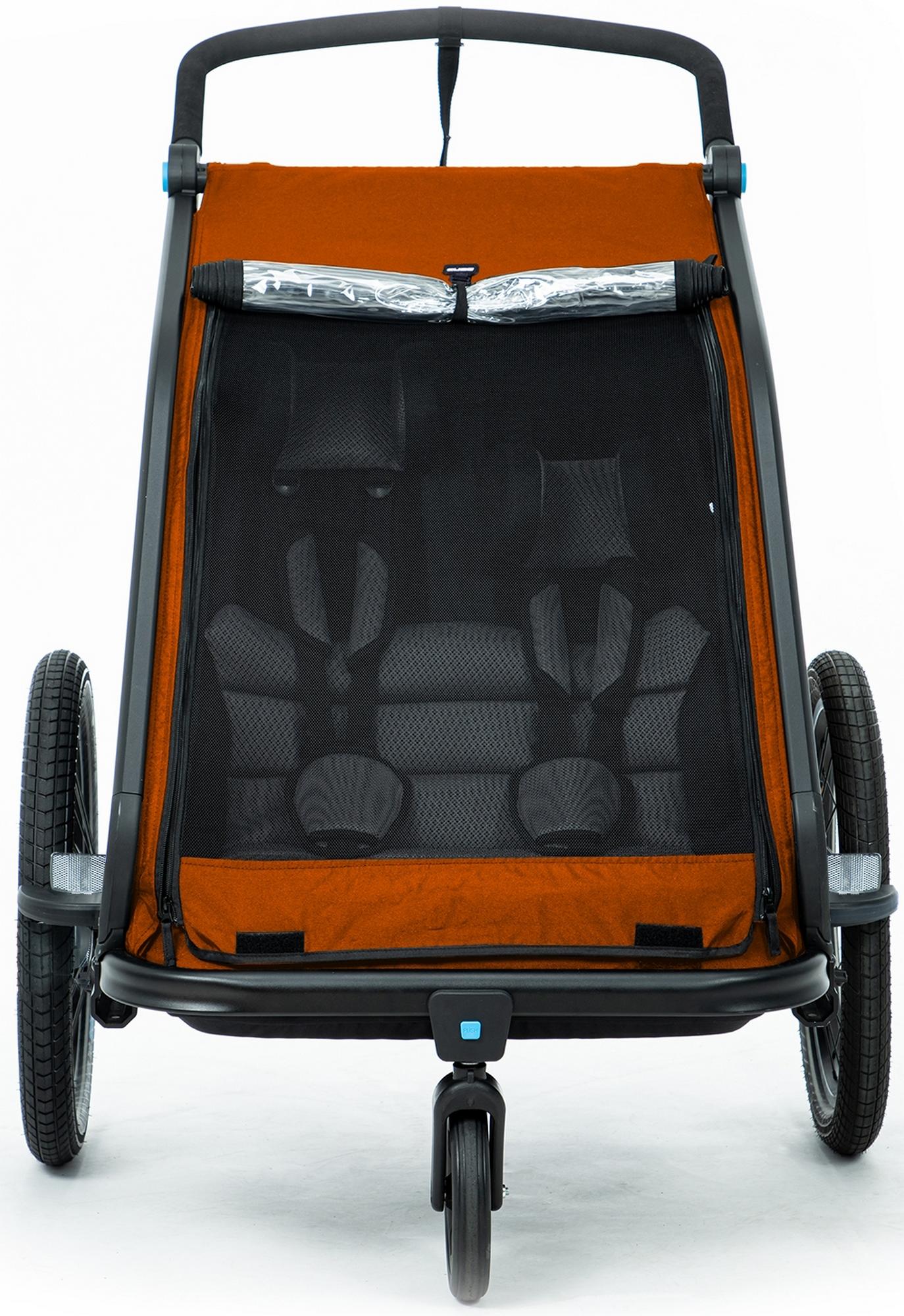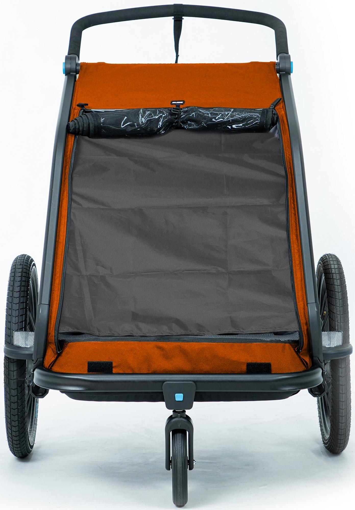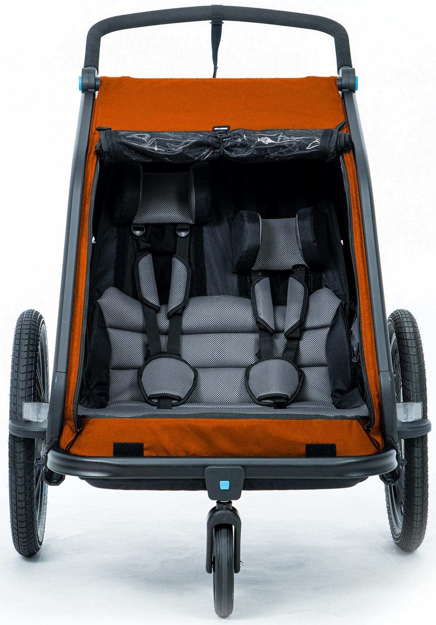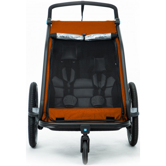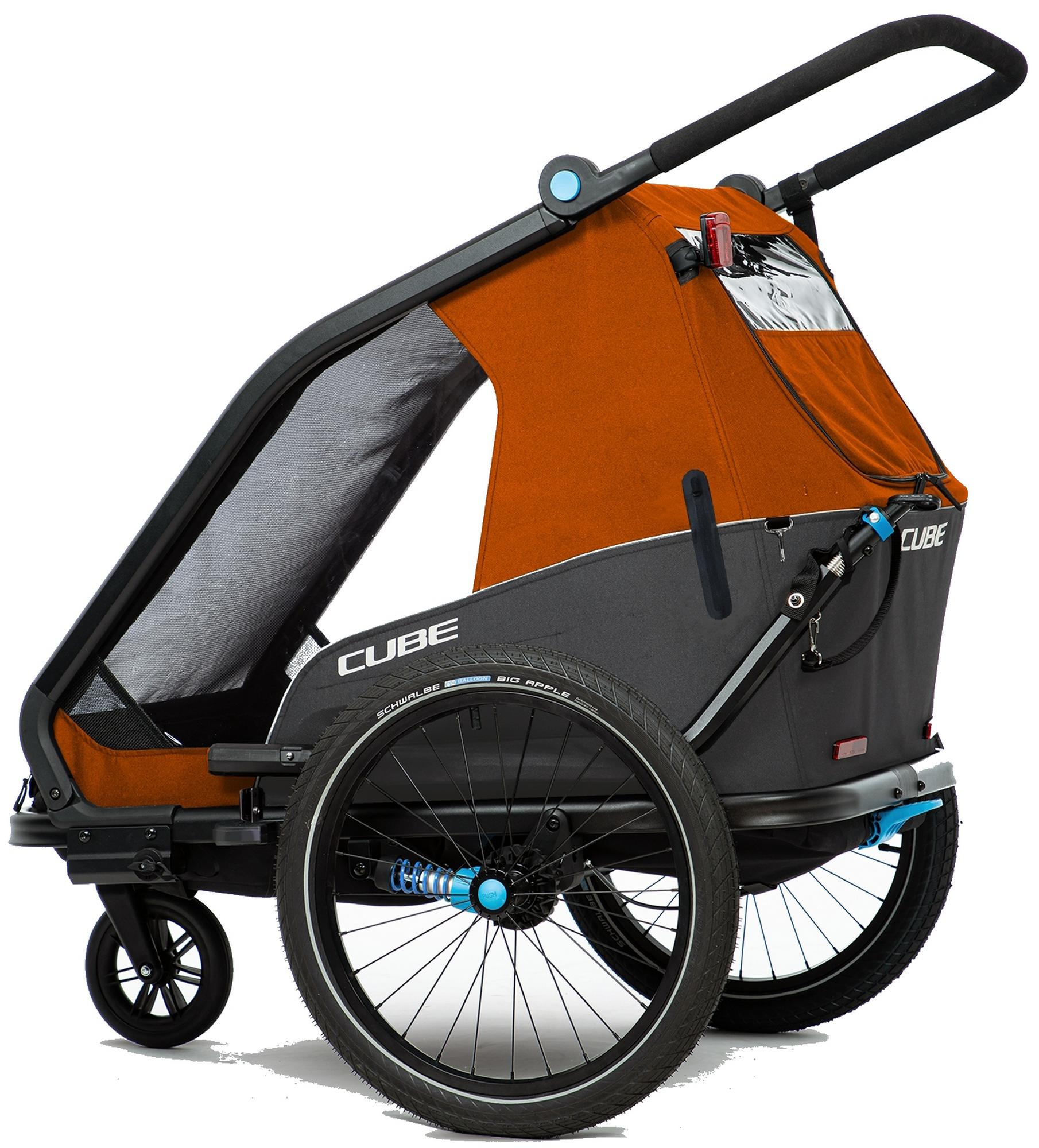 The cube kids trailer double cmpt is the perfect everyday companion. This sophisticated multi-talent is a bike trailer and kids' buggy in one. A large insect net extending across the front and sides keeps the bugs out without affecting the circulation of fresh air. Kids can nap in peace courtesy of the sun shade to protect against the bright light. The splash protection means you can keep riding even when it's muddy and wet outside while the kids stay dry. Seat and back padding and a headrest with helmet pocket make sure the little ones ride in comfort. Individually adjustable suspension can be adapted to the terrain and loading weight. For even more flexibility, the trailer is compatible with the jogger kit (available separately).