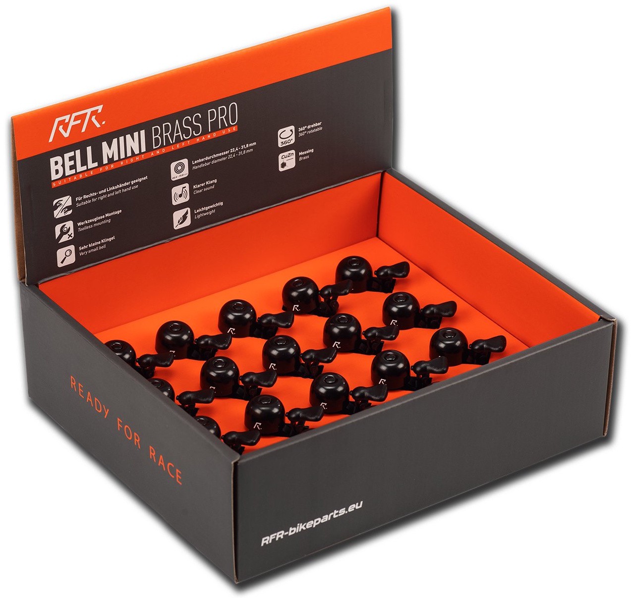 Counter display with 20 RFR Mini Brass PRO bells. This PRO version has a rubber strap fastening. Brass for a especially clear ring. Mini bell with a great and timeless design. The screw cap can be mounted on handlebars from 22 to 31.8 mm diameter and is suitable for both left and right handers.