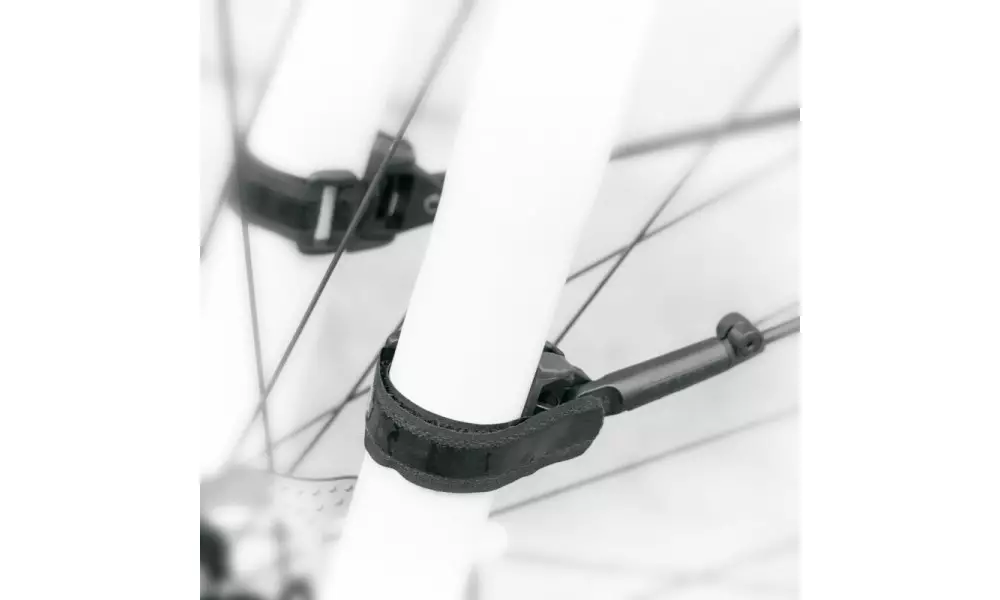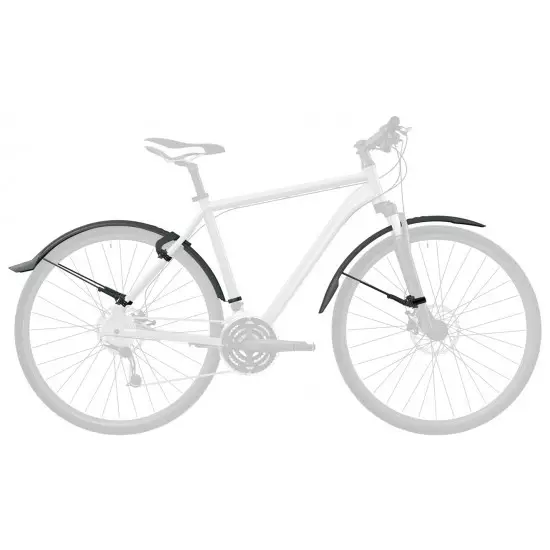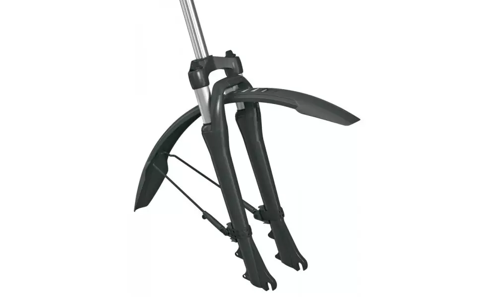 Mudguard set with an adjustable frame adapter. A new addition to the Velo family: the VELOFLEXX 65 mudguard set made of high-performance impact-resistant plastic combines the stability of a fixed mudguard with the flexibility of a clip-on mudguard. The VELOFLEXX bridge allows the rear mudguard to be mounted at the top of the seat bar without tools, using rubber straps. If, despite the disc brakes, there is a crossbar between the seat stays, the distance between the tyre and the crossbar must be 30 mm in order for the bike to be compatible with the VELOFLEXX mudguard. Sturdy yet flexible. At the front, the VELOFLEXX is mounted on the fork bridge with a rubberised hook and loop fastener or a cable tie. The frame adapters enable the mudguards to be mounted on any fork and for the angle to be adjusted. The black-coated stays provide even greater support. The VELOFLEXX set is suitable for fitness bikes, mountain bikes and city bikes. Hook and loop fasteners and rubber straps are included.