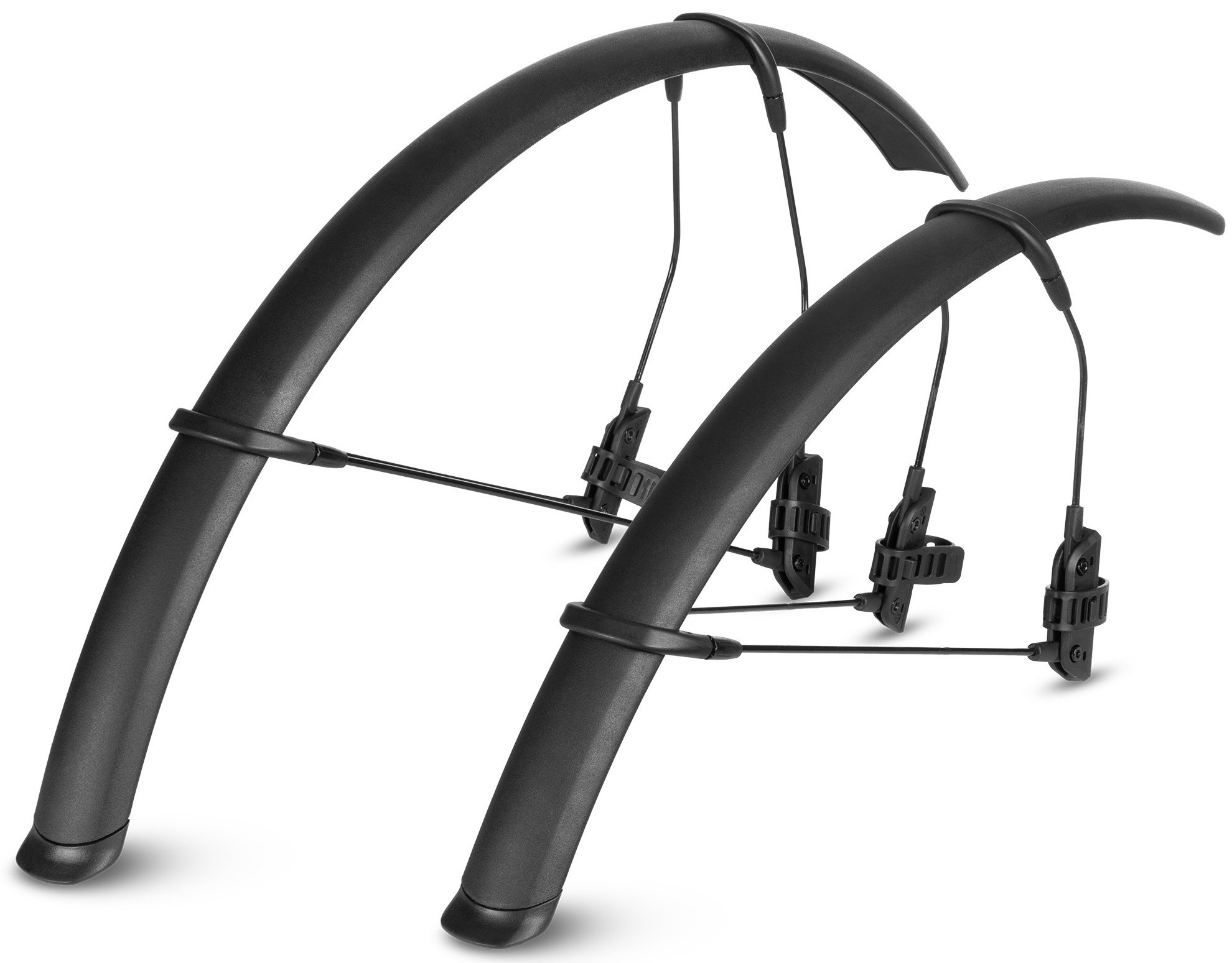 The ACID Clip-On Mudguard Set RACE 28" offers lightweight and effective protection for road bikes with 28in wheels. It is suitable for tyre widths up to 1.25in and attaches to the seat stays and fork. Installation is quick and easy using flexible rubber straps. The mudguard system consists of two components and features a removable, rubberised splash guard. Glossy icon details complement the sleek, minimalist design. The high-quality construction ensures reliable protection from spray and dirt on fast and furious rides.