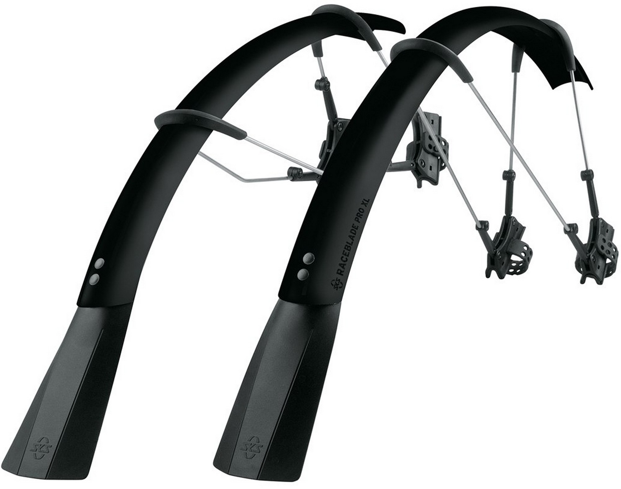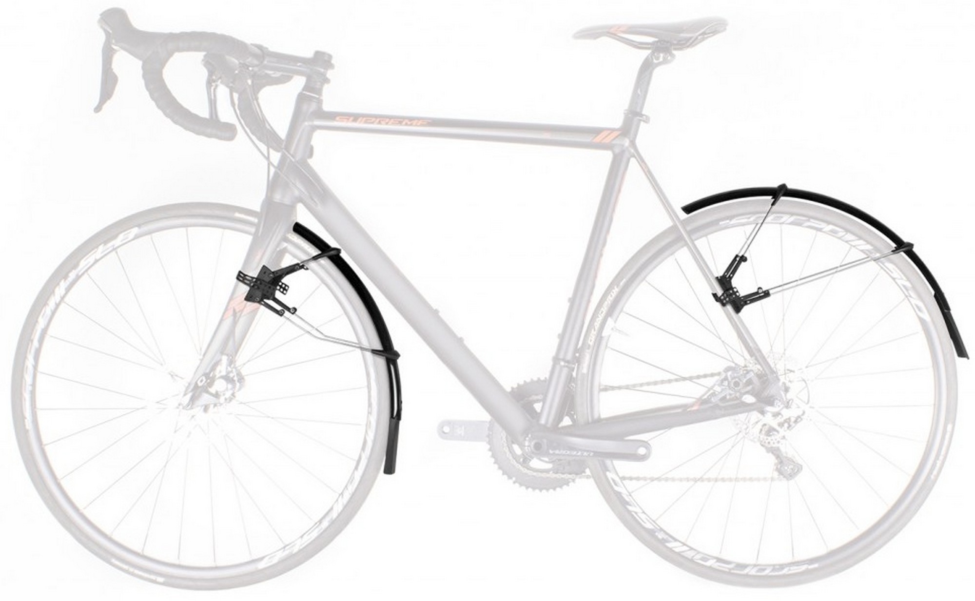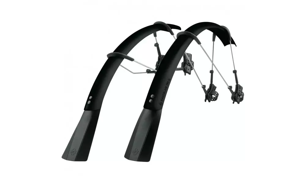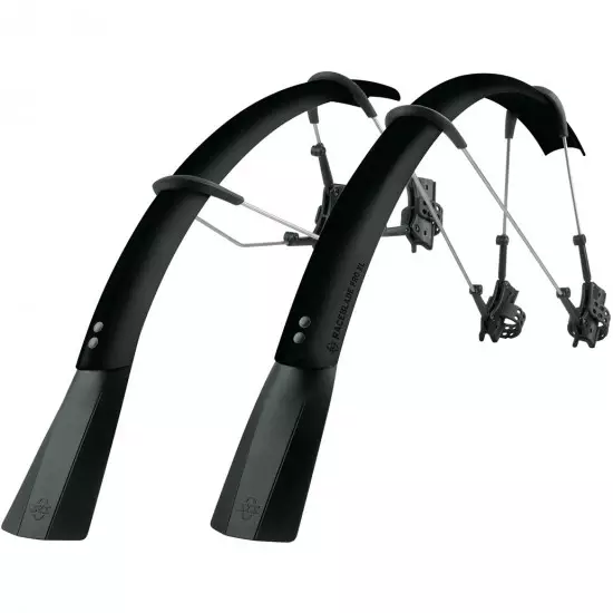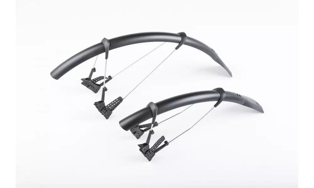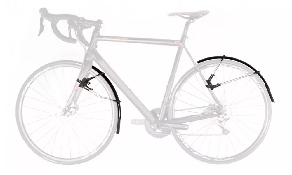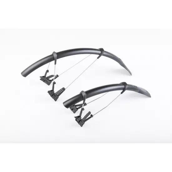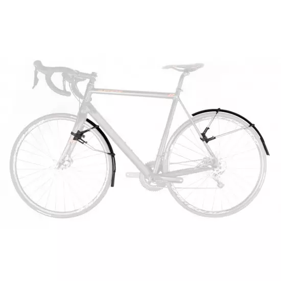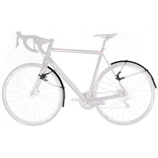 The ulimate clip-on mudguard set for road and cyclocross bikes for tyre width between 25 and 32 mm. Its smart, double hinged quick release fitting system also fits aero forks and is also compatible with disc brakes*, direct mount brakes and thru axles. Mudguards can be perfectly adapted to the radius of the wheel by adjusting the length of the stays. Its superlight extra long mud flaps give additional spray protection. In addition to using the quick release rubber straps it can also be fixed in place with zip ties. Includes adhesive protection kit to avoid damaging the paintwork.