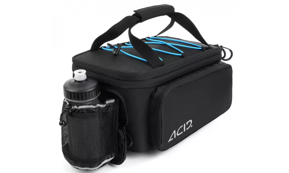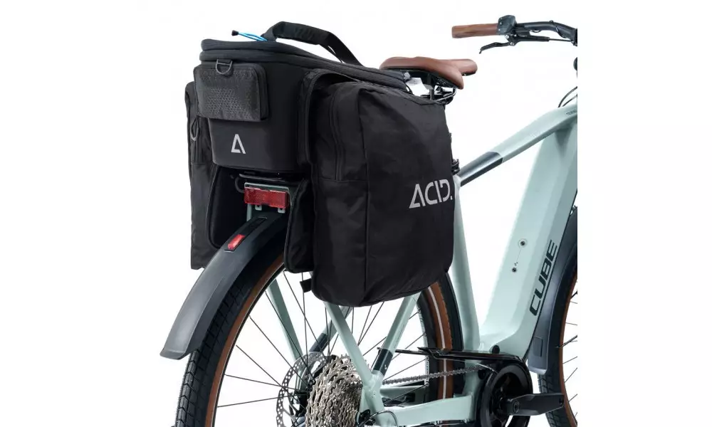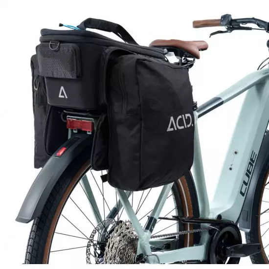 The TRUNK 8+16 Bag is compatible with all RILink carriers from ACID and CUBE. Roll-out side pockets and a resizable main compartment mean there's bags of room for your luggage but no excess volume when you don't need it. A handy shoulder strap, plenty of reflective details and a fold-out mesh bottle holder add practicality in spades. We even included a practical rain cover to keep the contents dry and your motivation high when the weather turns.