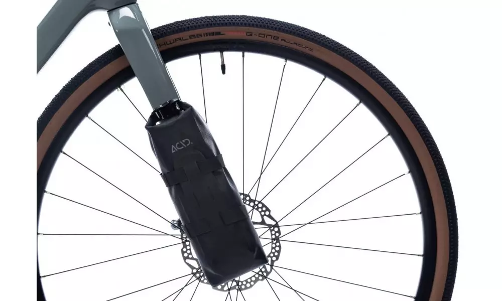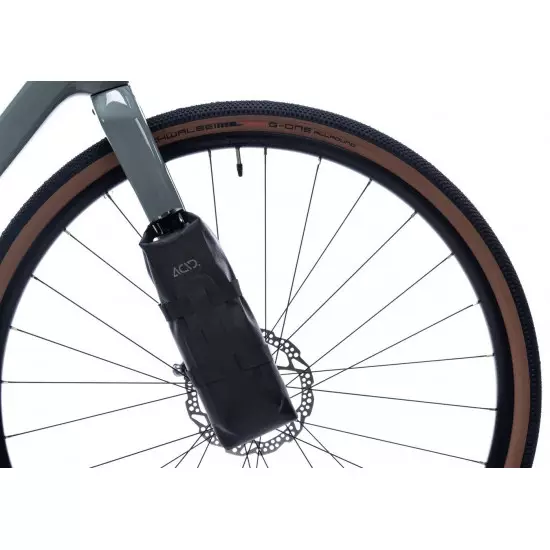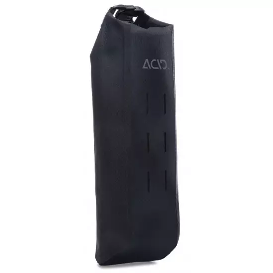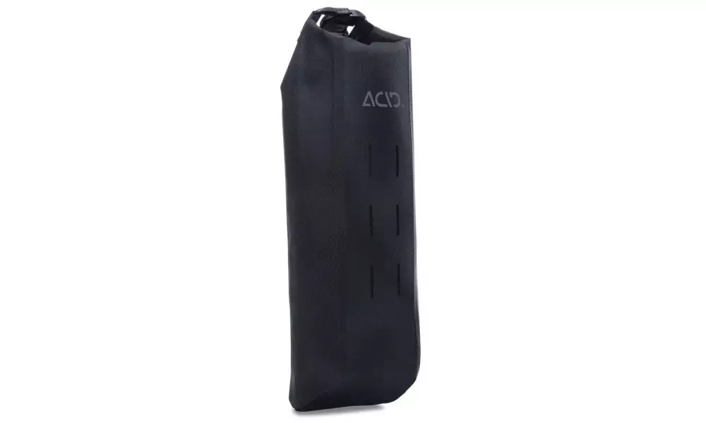 The one-litre ACID PACK PRO 1 drybag is made to work with the ACID FORK CAGE front fork carrier. Its waterproof welded construction uses abrasion-resistant outer material for a long lifespan over many miles. Mounts to the ACID FORK CAGE or directly to other bags using the included touch fastener straps through the MOLLE loops for a super-flexible way to carry extra load. Contact patches with the ACID FORK CAGE are reinforced for added longevity. Reflective details improve visibility in low-light conditions.