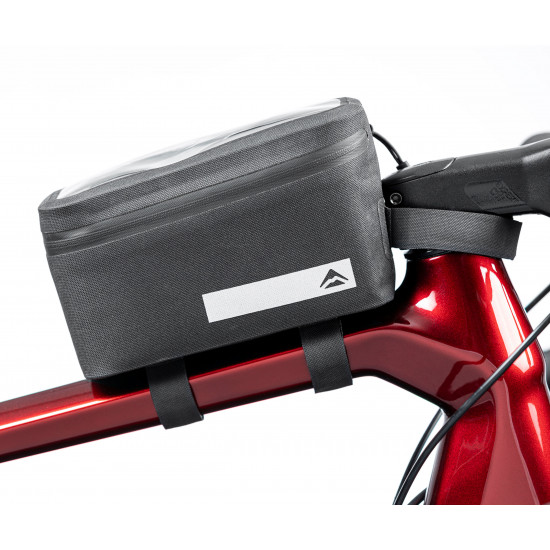 The Merida smartphone bag L is attached to the top tube. This means you always have your smartphone within easy reach for navigation. The waterproof material guarantees protection for your equipment and the padding protects it from bumps and scratches. The viewing window is touchscreen-compatible and allows you to make full use of your smartphone. In addition to a smartphone, the bag also offers space for a range of small items such as snacks, tools or keys.