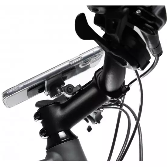 Commuters and tour riders who would like to have easy access to their phone on their bike have a solution: the acid phonemount case. Attached with a clamp to the left of the stem, it's designed to position the phone centrally and will work with 35mm and 31.8Mm diameter handlebars. The angle is adjustable and 360 degree rotation allows the phone to be switched between landscape and portrait format. The compact click-on/off adaptor is fixed to the rear of any phone case with the supplied 3m adhesive foil, providing a secure and quick-release attachment to the mount. The mount is compatible with all phone sizes and brands.
