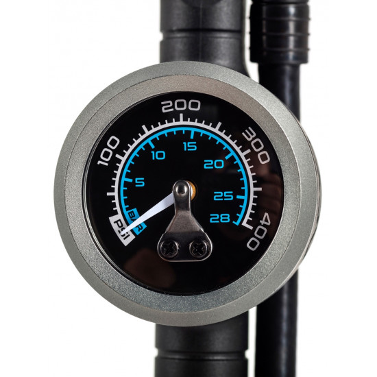 Our high-end shock pump includes a two-stage head for Schrader valves to stop air escaping on removal. Suitable for higher pressures of up to 400 psi and featuring an ergonomic Natural Fit handle. A precision pressure gauge and air release valve for micro-adjustments come in handy for ensuring the perfect chassis set-up.
