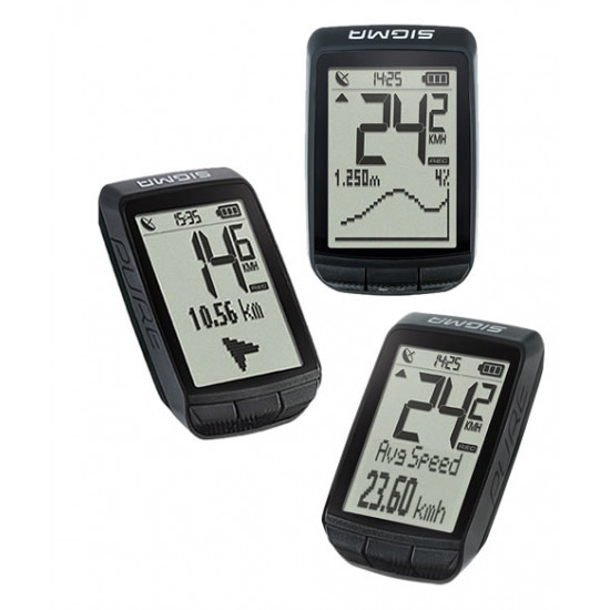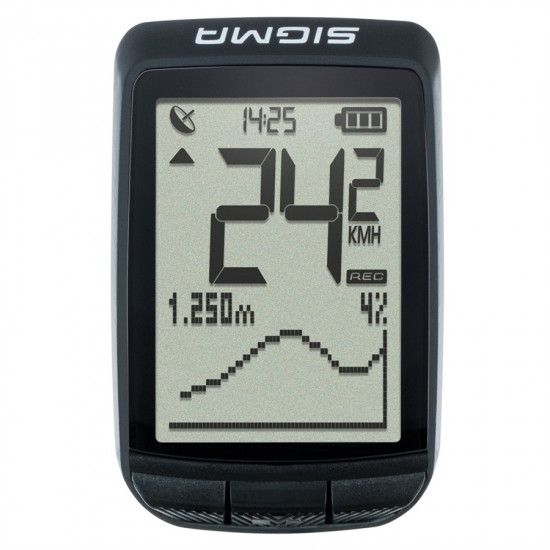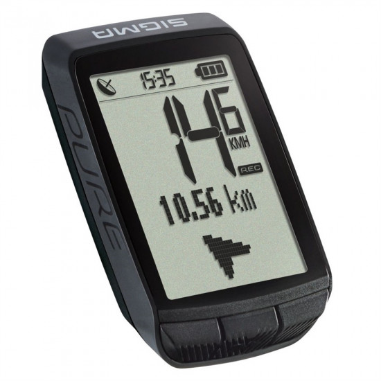 The entry into the world of GPS-based cycle computers! With the PURE GPS, the simplest operation meets the latest technology. The cycle computer provides precise altitude information via an air pressure sensor. In addition to the most important bike functions, all the altitude functions including the graphical height profile are clearly displayed on the large display. A simple compass navigation always shows the direction to the starting point or a selected point.Functions of the Sigma Sport PURE GPS :Current speedAverage speedComparison current / average speedMaximum speedDaily distanceTotal distanceRiding timeTotal timeTemperatureTimeCalories burnedTotal calories burnedCurrent heightCurrent incline / gradientAltitude meters uphillTotal altitude meters uphillMaximum altitudeGraphical height profileFeatures of the Sigma Sport PURE GPS :FC communication with Android Smartphone via SIGMA LINK AppDATA CENTER via USB interface PC / MACTraining statistics for 12 monthsTraining evaluation on the deviceFull text display in 7 languages110 h log memoryTool-free assemblyBattery life up to 15 hoursBacklightWatertightBattery: Lithium-Ion batteryIncludes: SIGMA PURE computer with GPS, 2 mounting brackets, micro USB cable