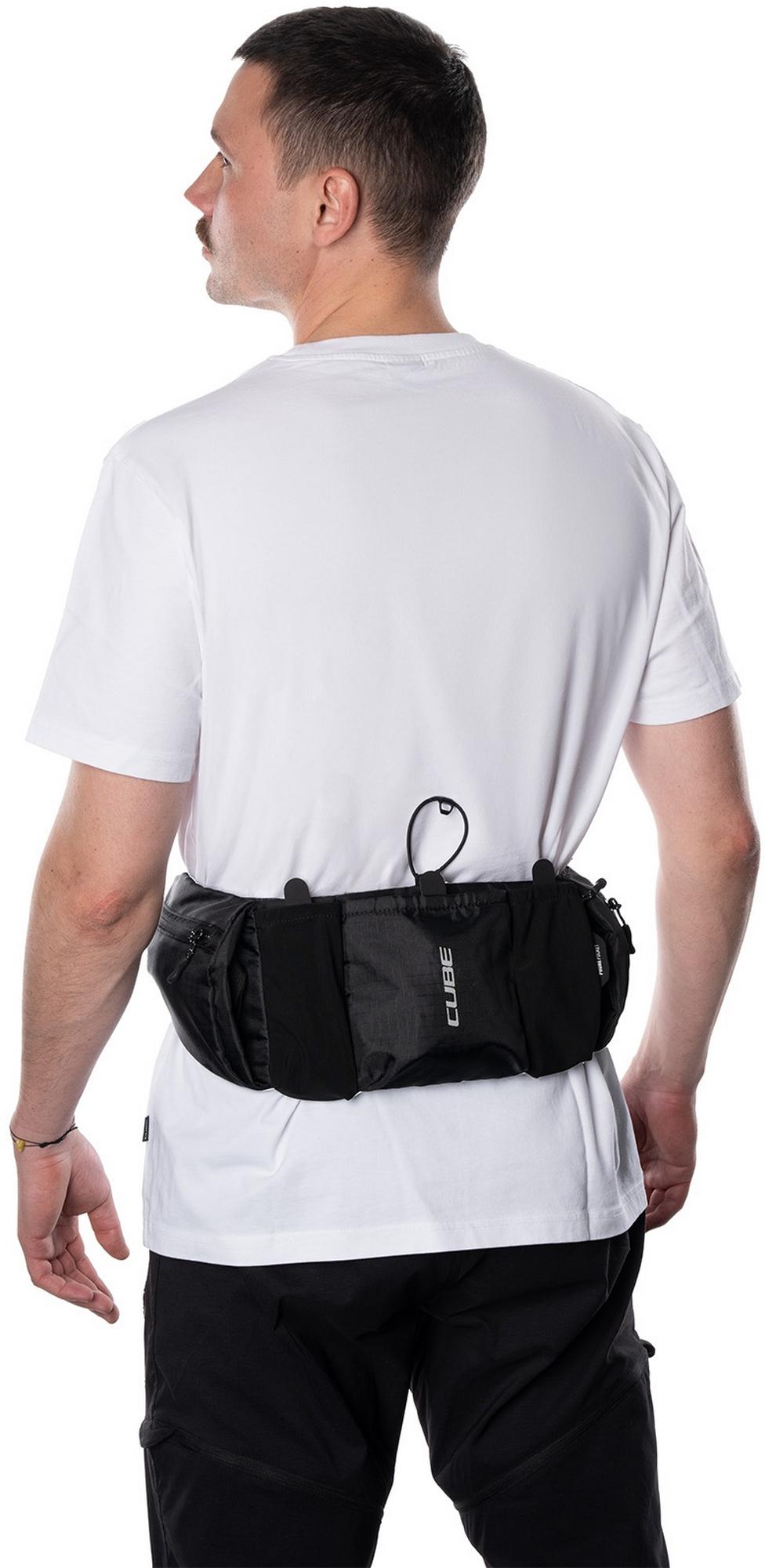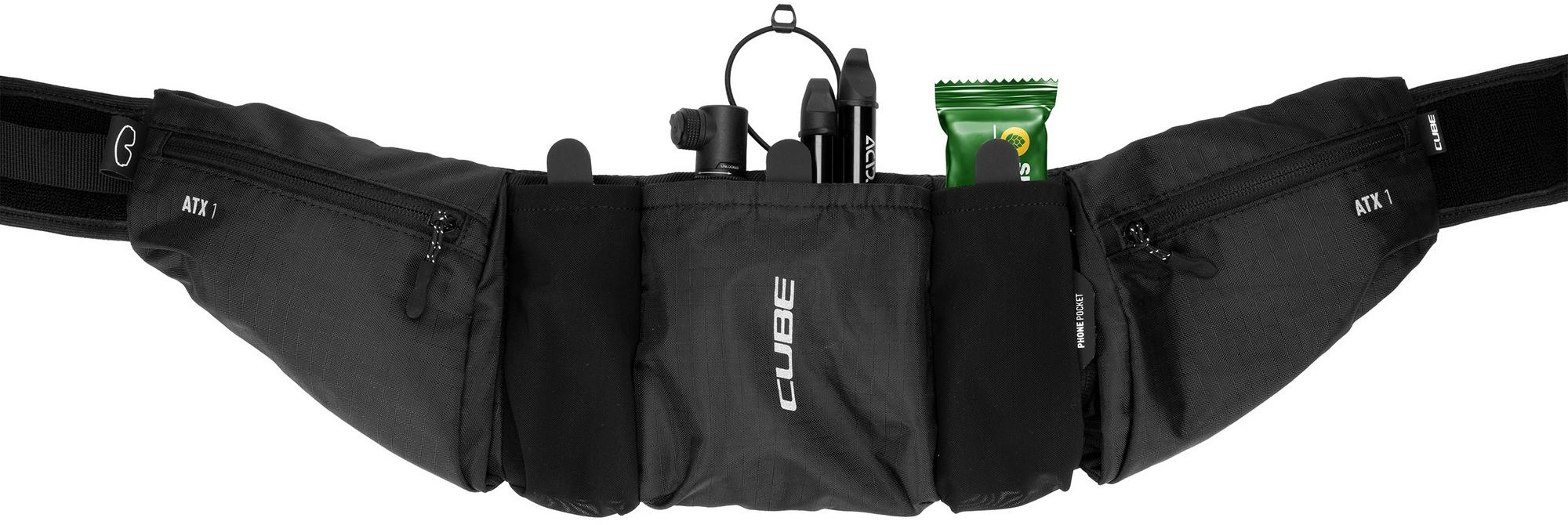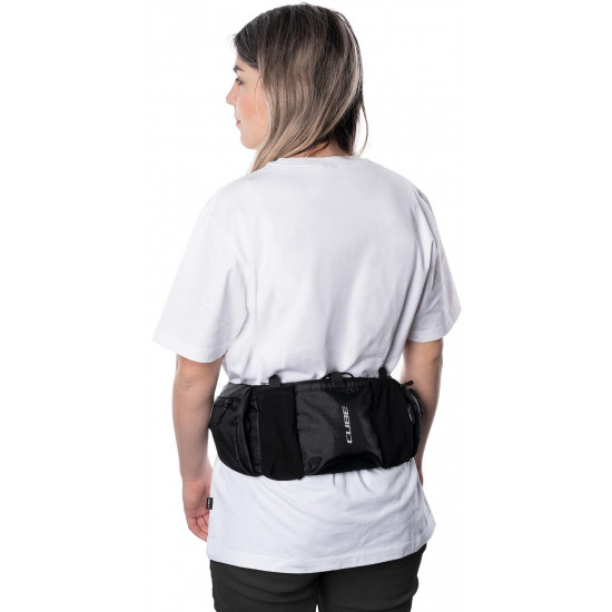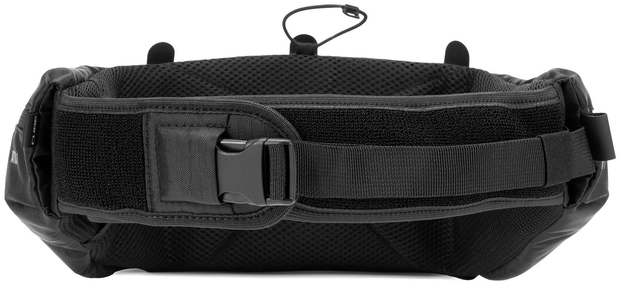 Compact, lightweight at 250g but with a total carrying capacity of 1 litre, the cube atx 1 hip bag is a convenient means of carrying essentials for mountain biking, road or gravel riding. The wide waist belt allows for a snug and comfortable fit so the bag sits in the ideal position. Pocket dividers enable quick access to the main compartments, and there's room for a water bottle in the middle pocket, secured with a rubber strap. A phone pocket with a zipper sits behind the main compartments and there are additional zipped pockets at each side. An easily accessible loop makes stashing a pair of glasses quick and easy and, in the unlikely event that the strap buckle breaks, it's available as a repair item.