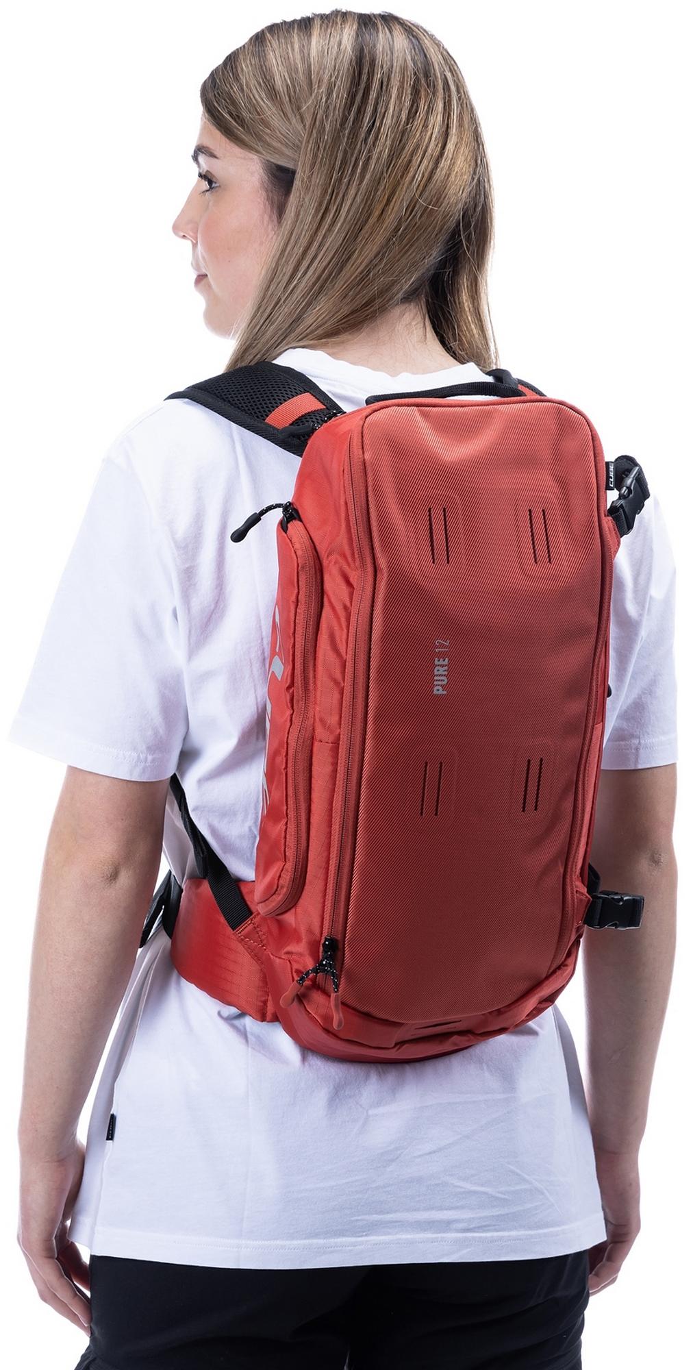 Need a backpack with room to stash everything you'll need on bike day? The pure 12 is the perfect choice! Ergonomic shoulder straps, soft hip straps and cube's own nf ergonomics back system developed in-house keep it sitting pretty for a backpack you can wear all day. We also added padding and ventilation so your back stays comfortable and fresh. The pure 12 is hydration system-compatible with a central outlet for the drinking tube. Practical highlights include a side tool compartment, a smartphone pocket and the option to attach a light. The backpack also features the versatile molle system, so it's easy to securely attach the small cube accessory bag 1 or cube accessory bag 2 using the integrated touch fasteners for practical extra storage.