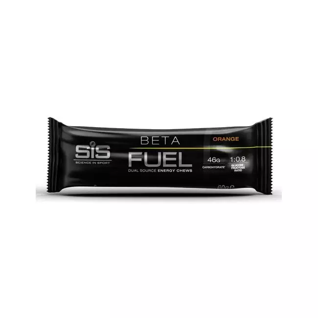 WHY YOU SHOULD USE BETA FUEL DUAL SOURCE ENERGY GEL CHEWS. As an endurance athlete exerting your body for periods typically longer than two hours, you need to take in between 80-120 g of carbohydrate per hour. Our Science in Sport Beta Fuel Dual Source Energy Gel Chews deliver 46 g of fast carbs in a convenient and tasty chew, which have been optimised with a new ratio that enhances power output and increases carbohydrate usage efficiency without gastrointestinal discomfort.NEW 1:0.8 RATIO REPLACES 2:1 RATIO. A 1:0.8 ratio of glucose to fructose increases the percentage of ingested carbohydrate that is oxidized (known as efficiency) from 62% to 74% when compared with a ratio of 2:1 . A 1:0.8 ratio of glucose to fructose reduces self-reported symptoms of stomach fullness when compared with a ratio of 2:1.