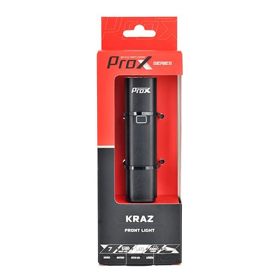 The Prox Kraz is a great all-round lighting option for public roads and comfortable off-road riding.The Front light with 1000 lumens is equipped with two lenses:- the lower one with a cut-off lens, which completely eliminates the glare of other road users and has a great effect on the width of light distribution- the upper lens is responsible for the greatest possible range and power of the lamp, giving comfort when riding off-road.All the electronics are enclosed in a sealed (at IPX4 level), robust, aluminium construction, and an aluminium handlebar holder is also included, complete with reduction rings to prevent scratching of the handlebars.The Prox Kraz is equipped with a double-sided charging socket - USB C, which can also serve as a Power Bank for most electrical devices.