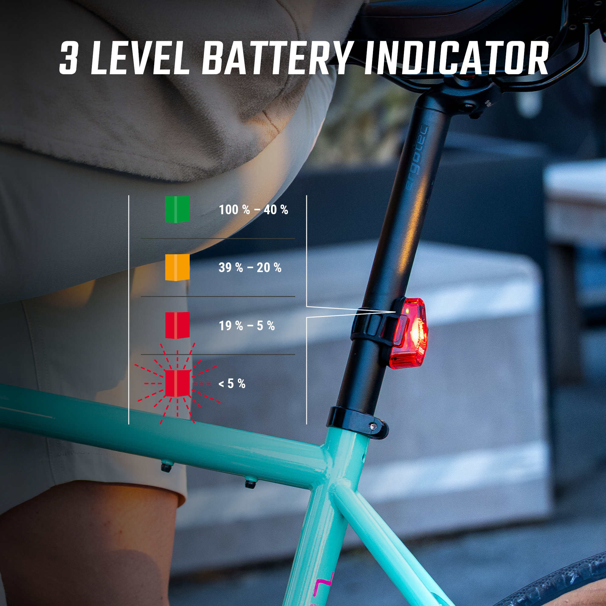 - BATTERY INDICATOR WITH THREE LEVELS A quick press of the control button and the NYTE 10 shows you how much power it has left. This allows you to switch to the more economical flash mode in good time. The battery indicator has three levels. This means you can always be sure that you still have enough power until the last metre.
