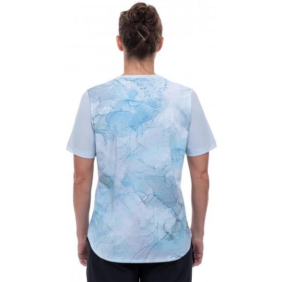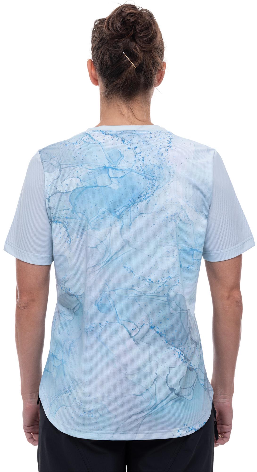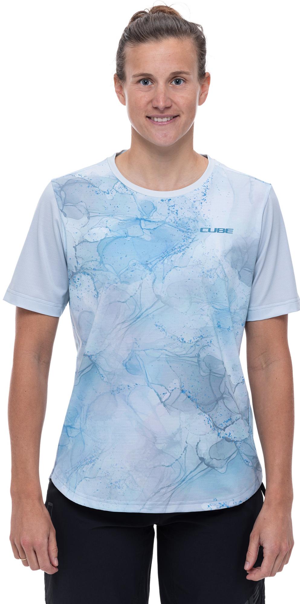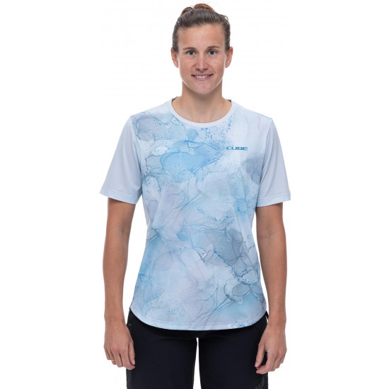 Whether youre racking up the miles on tarmac or hitting the trails, the womens round-neck cube mtb jersey is always a great option on warm days. The print: feminine and casual. The fabric: comfy, breathable and quick-drying. The fit: relaxed. In short: a great companion, whatever the terrain.