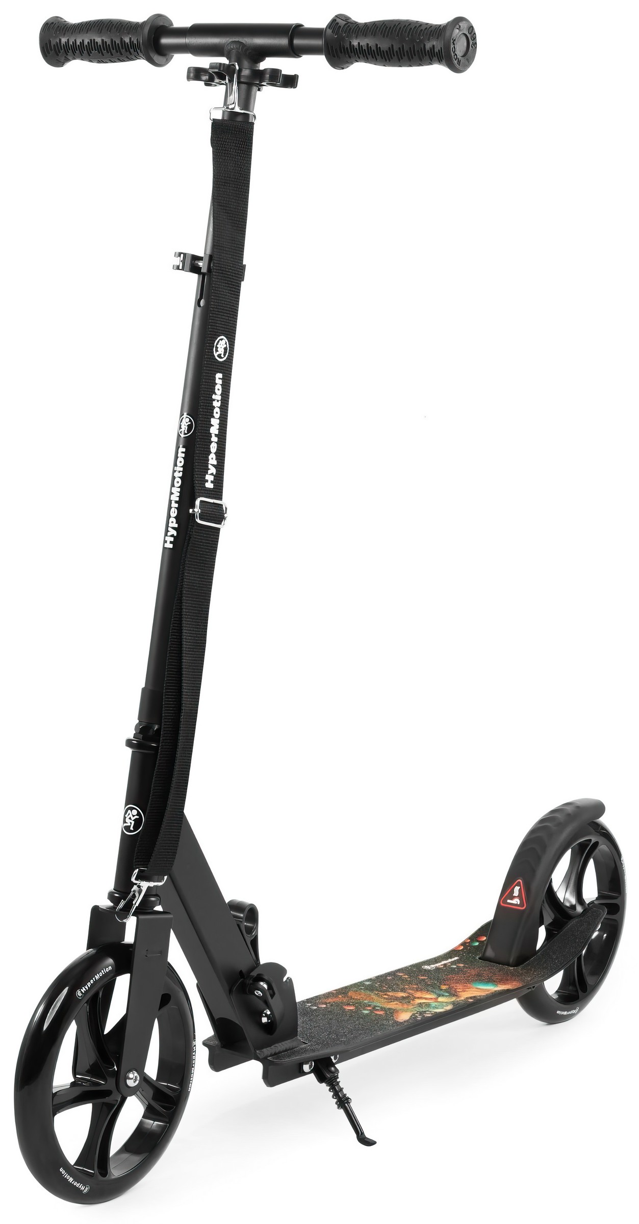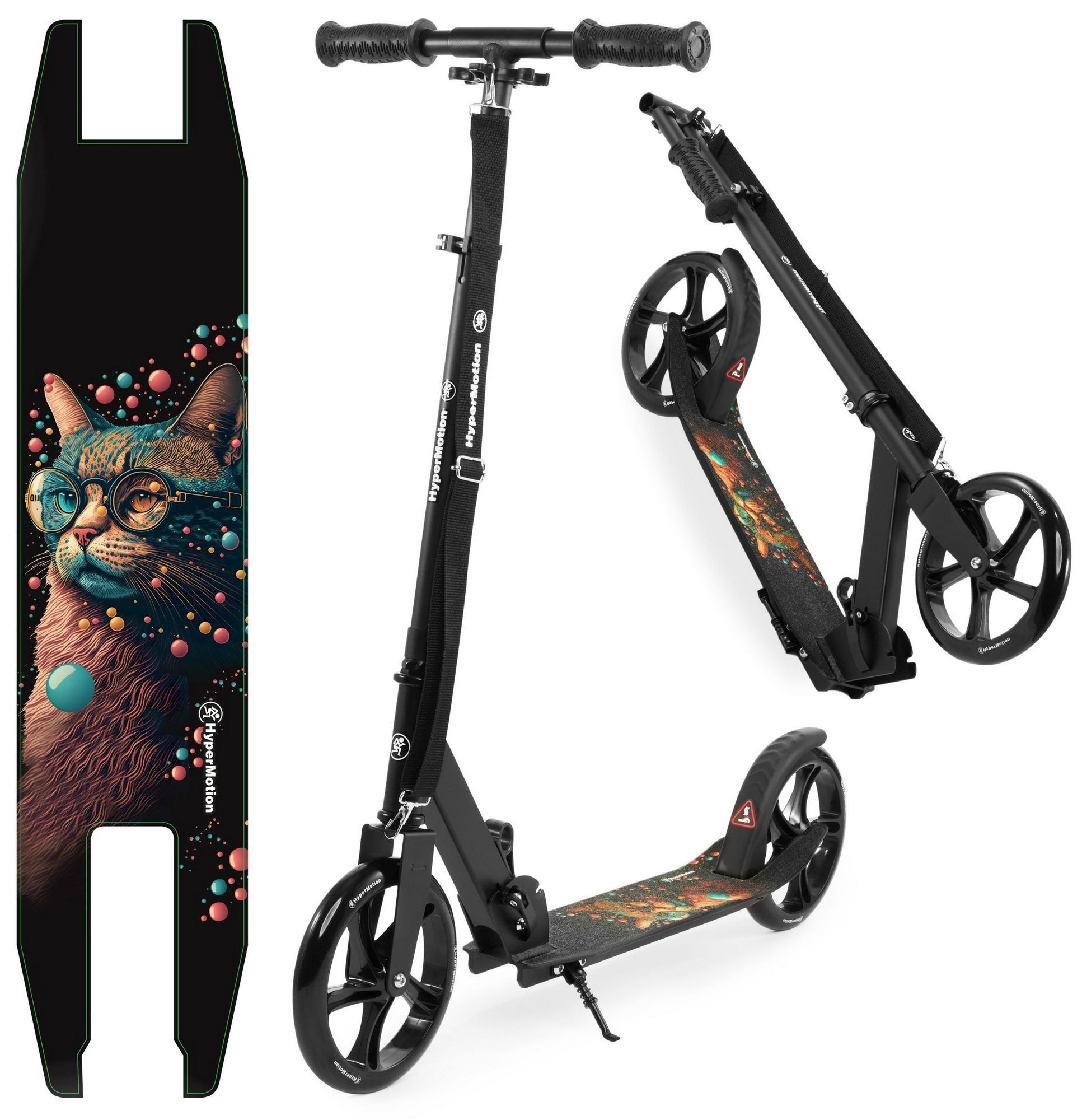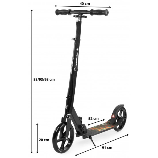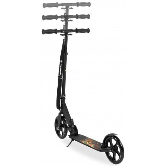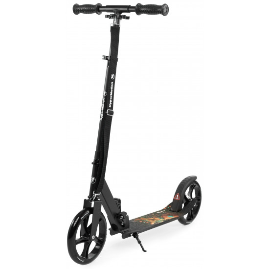 The Vibe Black HyperMotion scooter was designed with outdoor activities in mind. The galactic cat pattern placed on the platform makes it sure to appeal to older children and teenagers who are looking for ways to use up excess energy. Large wheels (200 mm) guarantee safe, comfortable and stable driving. The scooter grows with your child. The height of the handlebar can be adjusted to his needs thanks to the possibility of 3-step adjustment . The whole is complemented by an extremely solid structure based on a steel frame.