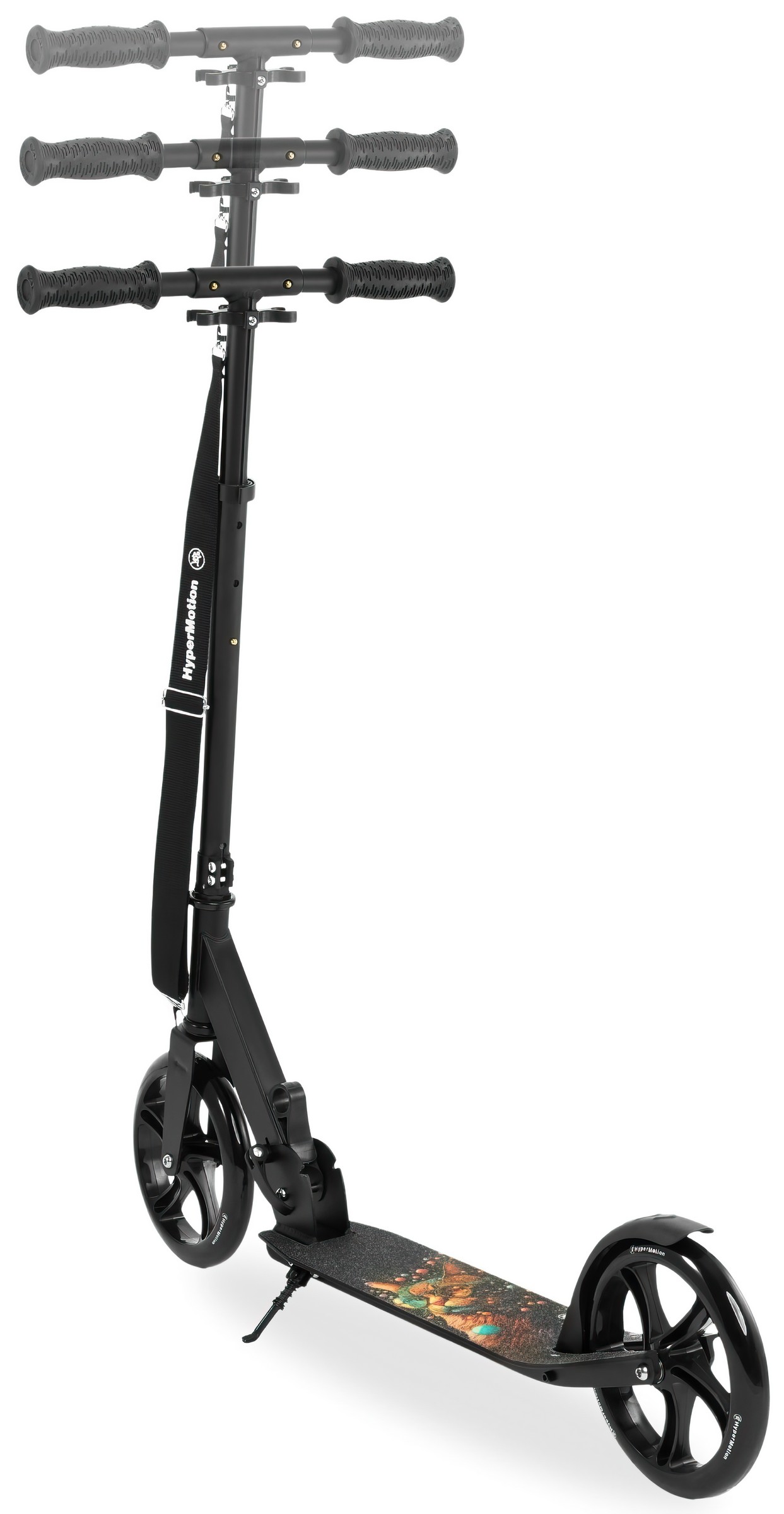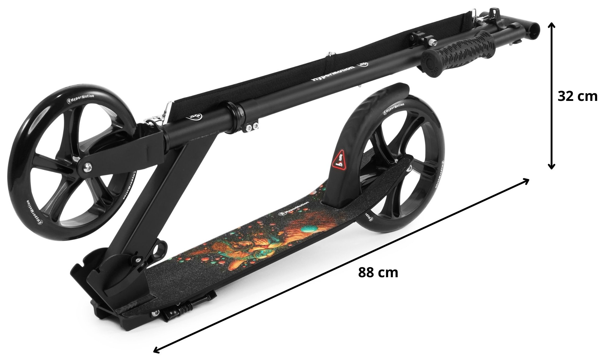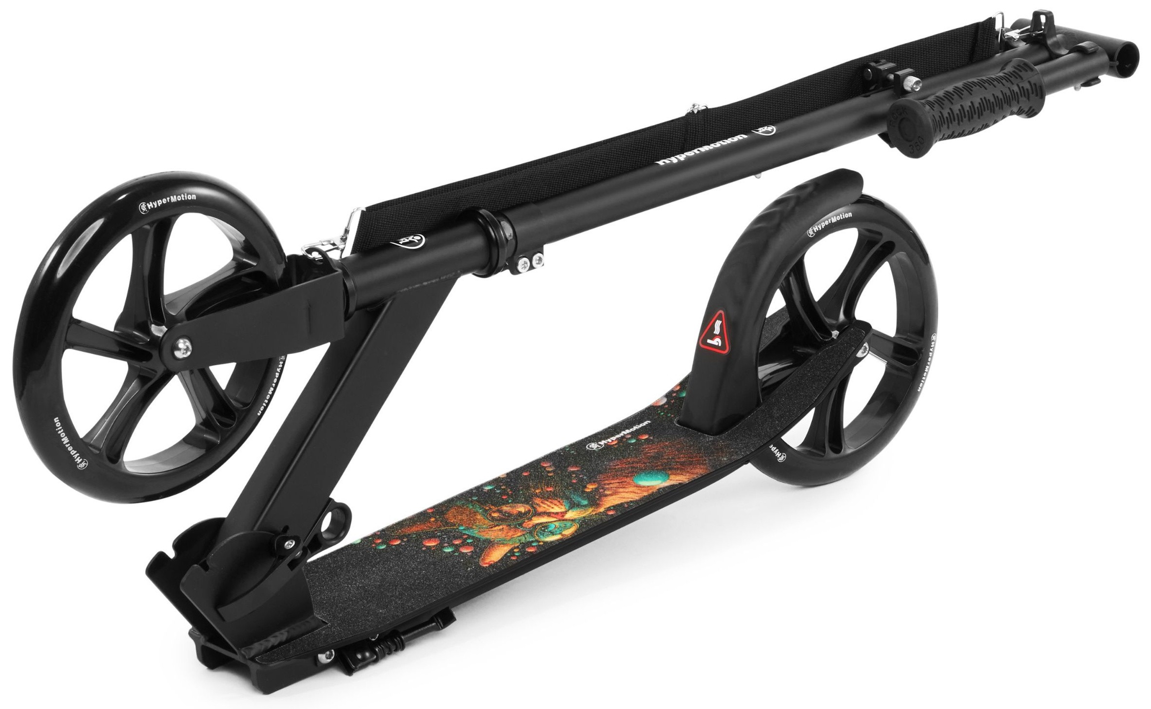 The Vibe Black HyperMotion scooter was designed with outdoor activities in mind. The galactic cat pattern placed on the platform makes it sure to appeal to older children and teenagers who are looking for ways to use up excess energy. Large wheels (200 mm) guarantee safe, comfortable and stable driving. The scooter grows with your child. The height of the handlebar can be adjusted to his needs thanks to the possibility of 3-step adjustment . The whole is complemented by an extremely solid structure based on a steel frame.