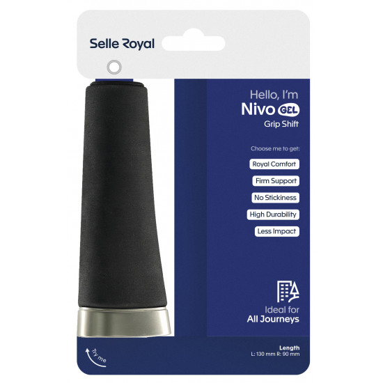Ergonomic bike grips with gel-like comfort for relaxed riding. The Nivo Gel bicycle grips combine ergonomic design, innovative materials and the proven comfort of Selle Royal for a pleasant riding experience – ideal for everyday cyclists, touring cyclists and e-bike users. The gel-like feel ensures long-lasting comfort and effective damping of vibrations and shocks. The flat contact surface supports a natural wrist position and offers a generous palm rest, while the rounded grip profile ensures secure handling and a comfortable fit for all hand sizes. Thanks to the non-slip upper material, hands stay dry and clean even on longer rides – without a sticky feeling. The robust design with high abrasion resistance also ensures high durability and reliable performance, even with intensive use.