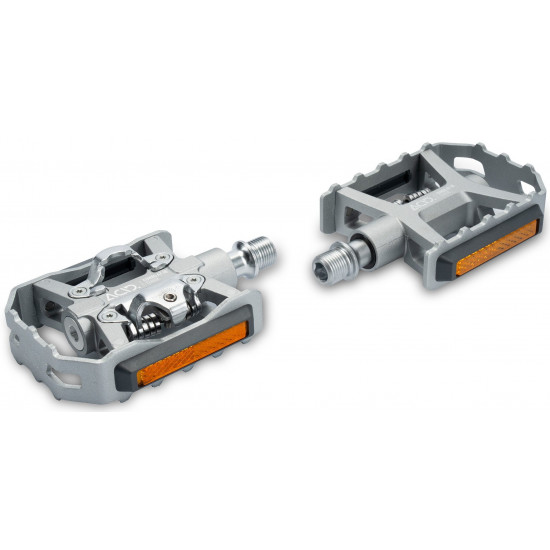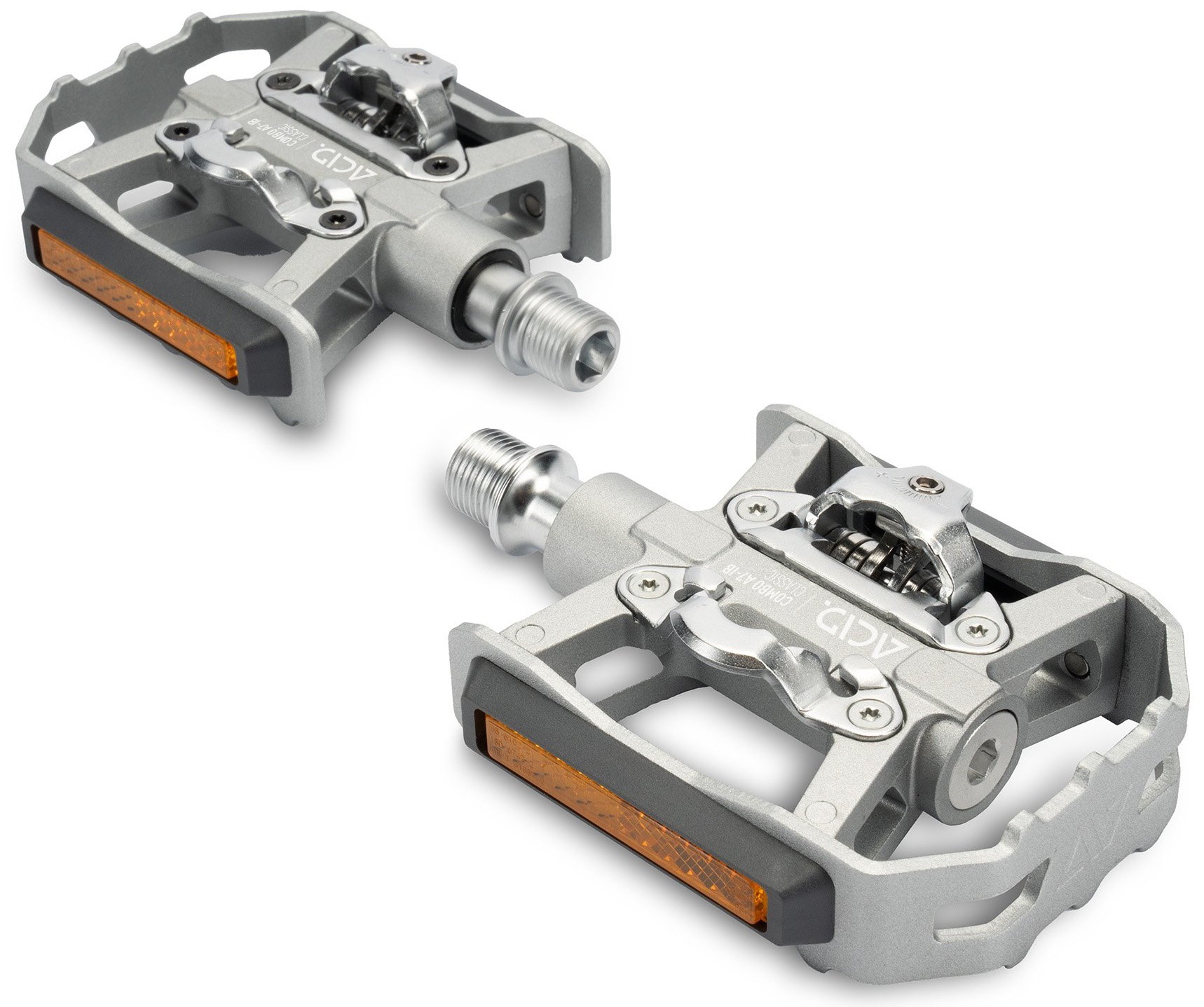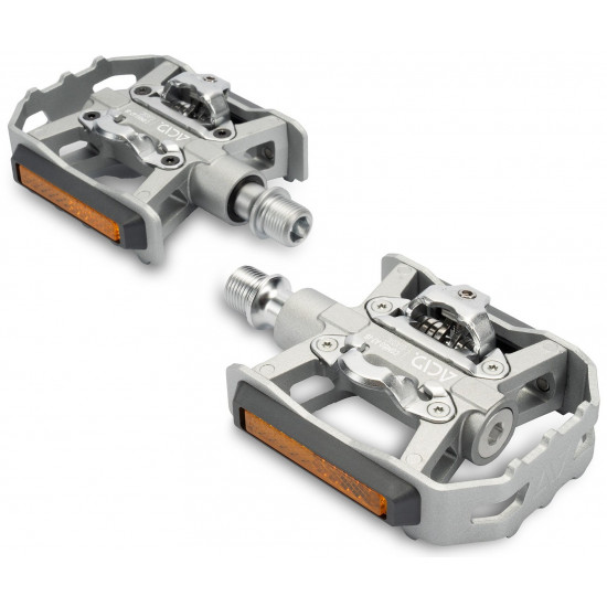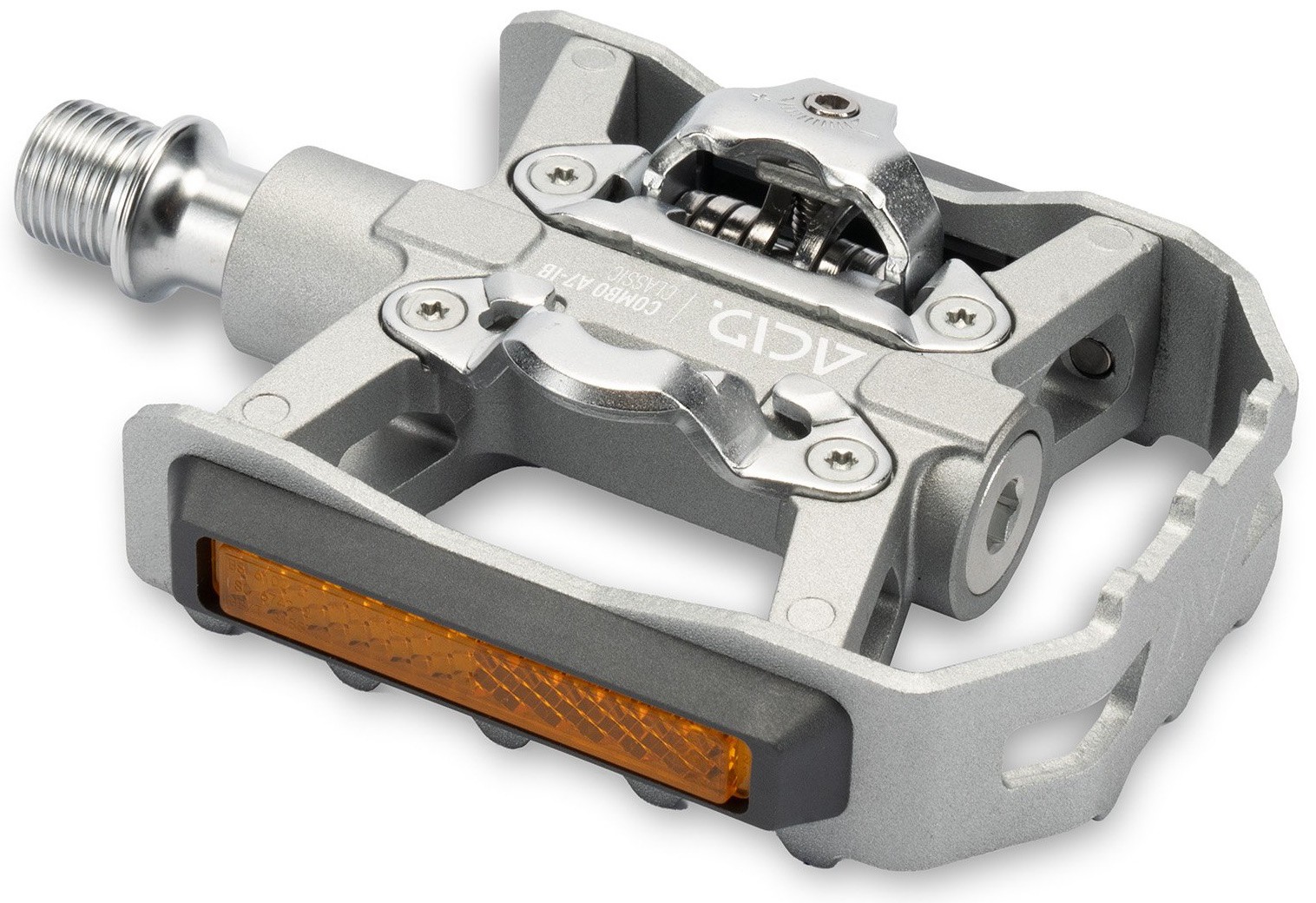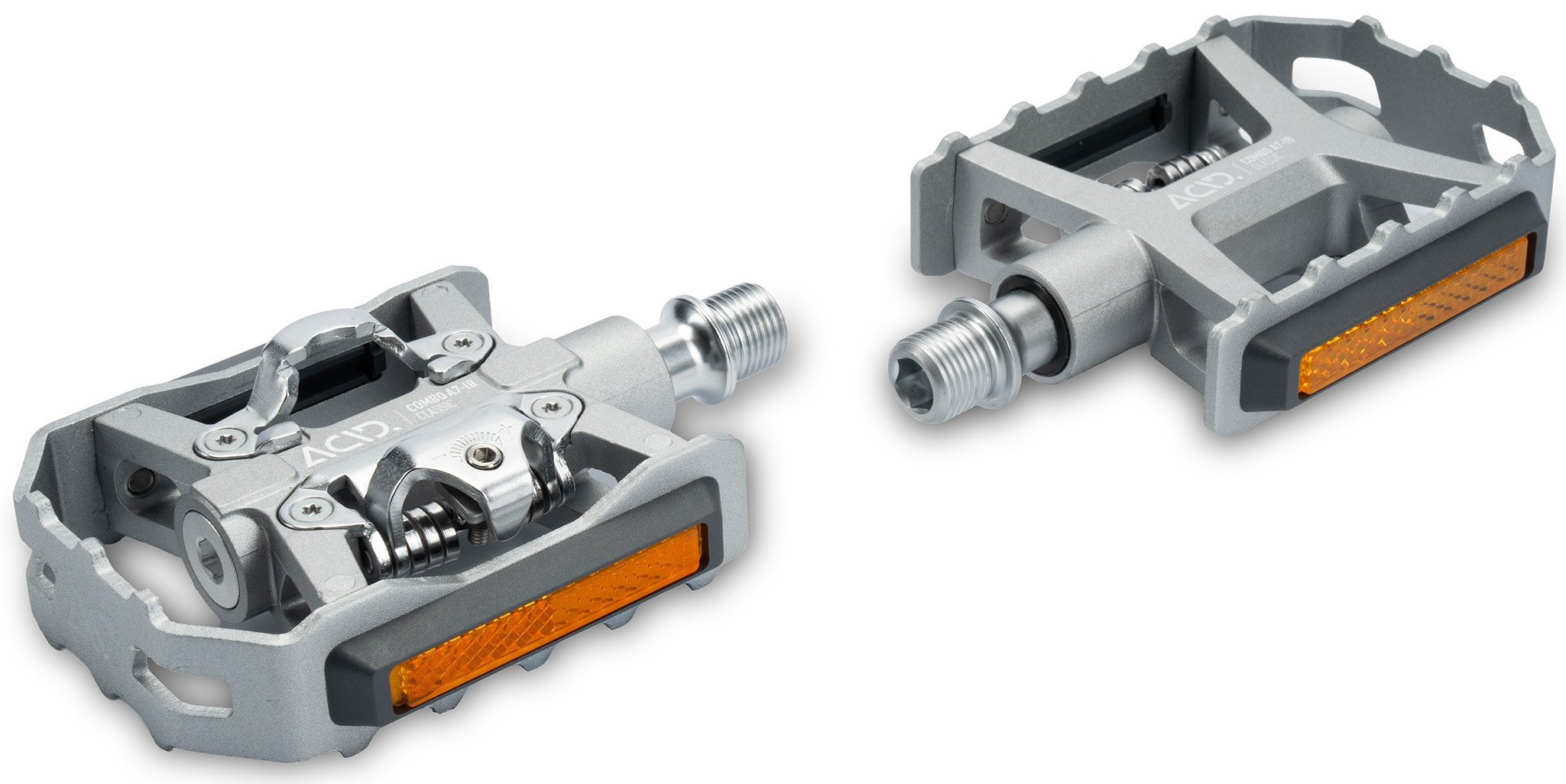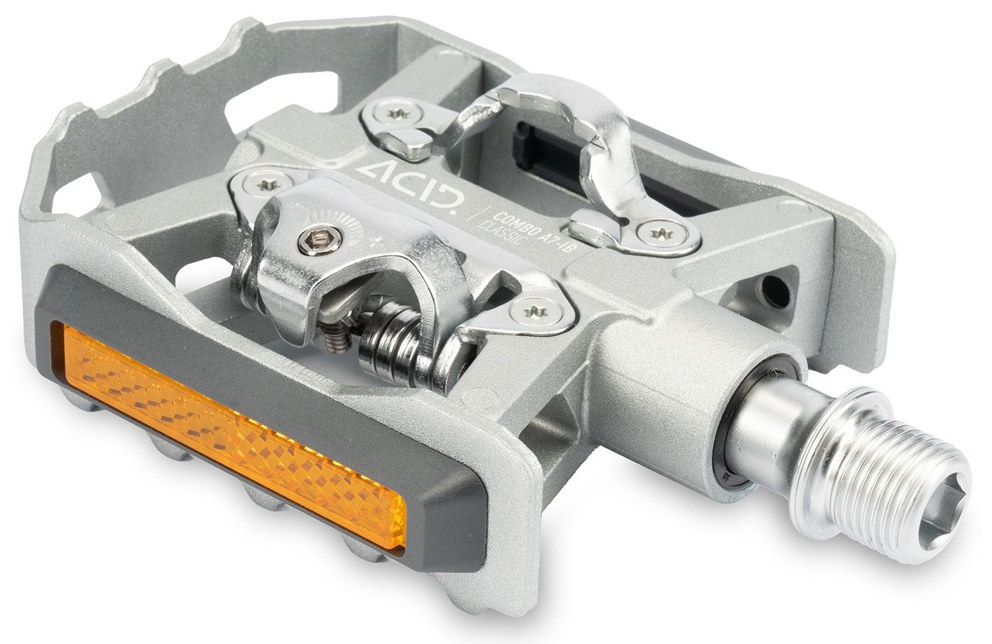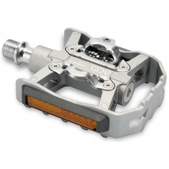 With its retro-inspired looks, silver colour scheme, flip design and SPD clipless pedal compatibility, the ACID pedal COMBO A7-IB Classic offers the best of all worlds. The aluminium cage with integrated pins for a secure grip is perfect for use with any footwear, offering just-get-on-and-go functionality. On the reverse side, the SPD-compatible binding system allows any SPD cleat-equipped shoe to clip in, for a more sporty ride. StVZO-certified reflectors comply with all German road traffic regulations, for added visibility. And sealed industrial and needle bearings plus a CNC-machined Cr-Mo axle ensure a long, trouble-free service life.