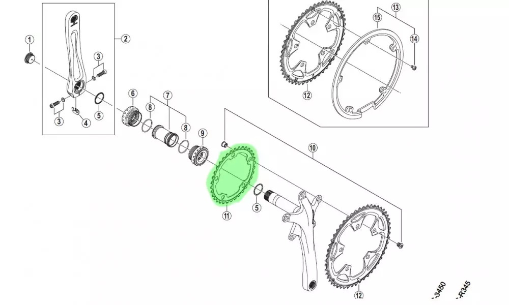 - Can also use the 34T Inner Chainring from FC-3450 or FC-R345, these are a "B" match which indicates that the parts are usable, but differ in materials, appearance, finish and size etc.