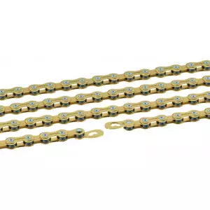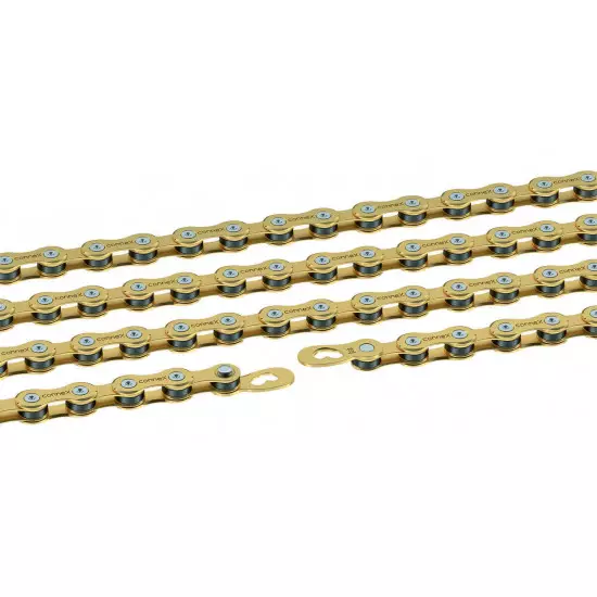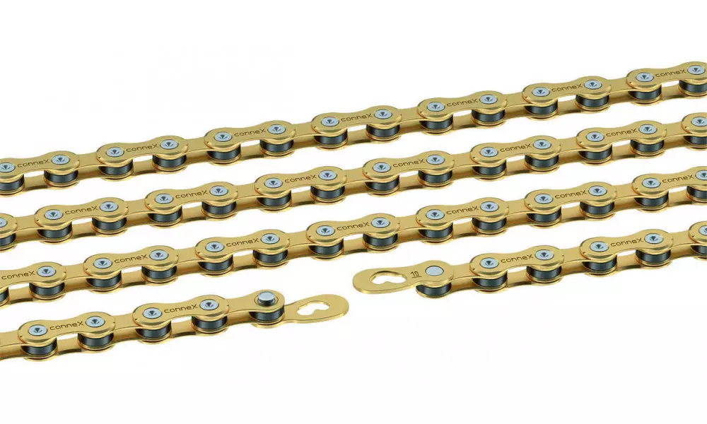 Connex 10sGBrassIts high-grade brass coating offers reliable protection against corrosion, while the golden look additionally provides your bike with the perfect style factor. Top gear-changing properties - thanks to the Connex high performance plate.Connex LinkDimensions: 1/2" x 11/128"Pin length: 5,90 mmRoller width: 2,20 mmPin ejection pressure: >2000 NPin hardening: XHBLinks: 114Weight: 264 gFor all 10-speed systemsSuitable for mountain bike and road bike