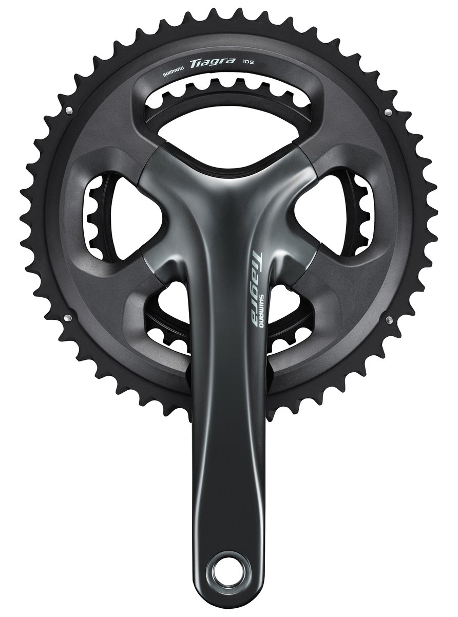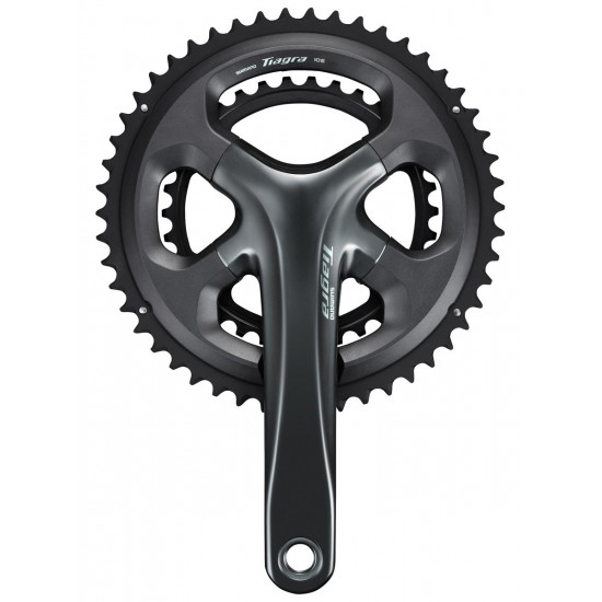Shimano Tiagra FC-4700 2-piece crankset with integrated axle for 2x10-speed drivetrain. Modern and aerodynamic capless crank arm design with glossy grey anodized surface coating. Optimal balance between stiffness and lightweight. Optimum power transfer motivates riders to pedal further and faster.Reinforced 4-arm constructionBCD (Bolt Circle Diameter): 110 mmGear combination (OPTIONAL): 50-34T OR 52-36TCrank arm length: 175 mmMaterial: aluminum, anodized and fibreglass-reinforced plasticCompatible with HollowTech II bottom bracketBottom bracket is not included (sold separately)Compatible with 10-speed chainsChainline: 43.5 mmQ-Factor: 150 mmWeight: ~ 910 gHyperGlide specially positioned shift ramps and tooth profiles for improve chain control during shifting. Fast and responsive indexed shifting is the result.HOLLOWTECH II - Providing the best balance of stiffness, strength, weight and rotating performance The concept of HOLLOWTECH II technology is focused on producing a superior crankset which will maximize a riders power transfer. The rigidity of the crankset ensures pedaling efficiency while its weight, a key element of the crankset, you want light, aids in cycling longer distances over which the rider needs to pedal more. Naturally, SHIMANO strove for the optimum balance between the conflicting needs of stiffness while producing a lightweight crank. HOLLOWTECH technology is an ultra-lightweight hollow crankarm created by SHIMANO with the companys own proprietary forging technology that also maintains rigidity. The addition of HOLLOWTECH II technology integrates the bottom bracket axle with the right crankarm for more stiffness and a weight savings to achieve a high-dimensional balance. Its outboard bottom bracket (sold separately) bearing system provides better weight distribution and more pedaling stability, allowing for more efficient power transfer. The HOLLOWTECH II crankset has been developed by pursuing the optimum balance of stiffness and rotating performance in a lightweight and beautiful crankset design. Moreover, HOLLOWTECH II crankset has a high-precision sealing in the bearing area to increase durability maintaining the excellent rotating performance for long periods.