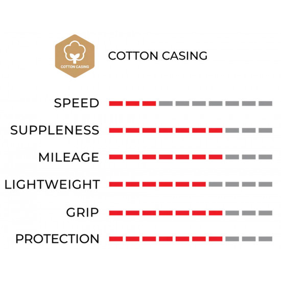 Cotton Casing: Vittoria is the first and still number one producer of cotton tires. As of today, only Vittoria best road tires are made out of cotton, a light material which makes the casing very flexible. Cotton threads have the thinnest structure in the tire casing technology, with benefits related to lightweight and flexibility. This characteristic allows to develop casings with a higher number of threads per inch, up to 320 TPI for the top-quality cotton casings. This property allows the tire to conform closer to the roads surface, providing a smoother ride, easier rolling, and better grip. In order to boost the overall strength of the casing, Vittoria uses Cotton yarn, which is a particular type of yarn made by cotton and aramid fibres combined. Vittorias Cotton casing is used for Pro Competition products, proven by multiple victories as in Tour de France, Giro dItalia, Vuelta a Espa?a, Classics, World Championships, European Championships and Olympic Games.