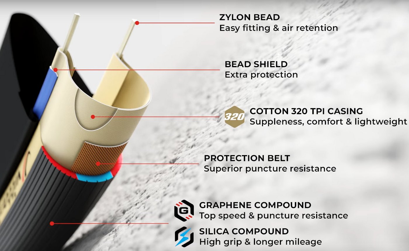 - Compound: Graphene for top speed and puncture protection + Silica for high grip and durability