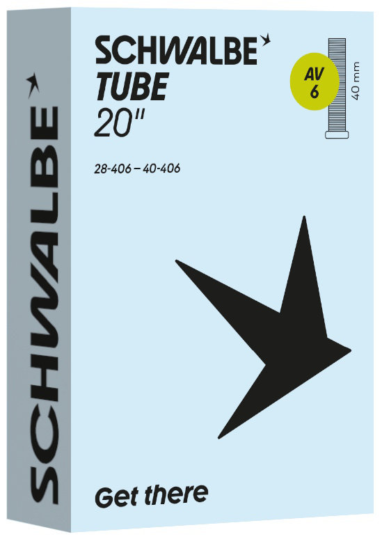 Schwalbe standard bicycle inner tube no. 6. For bicylce tires in 20" inch (ETRTO 28/40-406). Retains air for an above-average length of time. Thanks to the best material quality and uniform wall thickness. Maximum reliability that has proven itself millions of times over.
