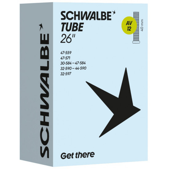Schwalbe standard bicycle inner tube no. 12. For bicylce tires in 26" inch (ETRTO 47-559, 47-571, 30/47-584, 32/44-590, 32-597). Retains air for an above-average length of time. Thanks to the best material quality and uniform wall thickness. Maximum reliability that has proven itself millions of times over.