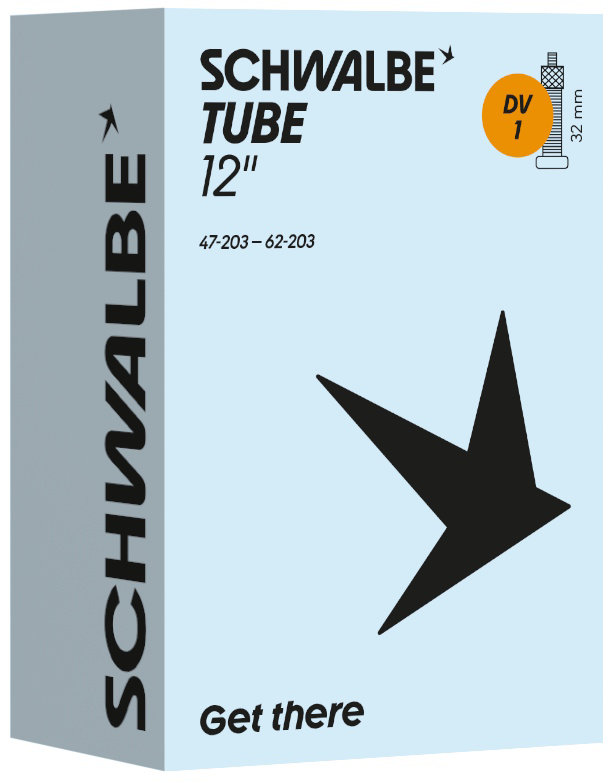 Schwalbe standard bicycle inner tube no. 1. For bicylce tires in 12" inch (ETRTO 47/62-203). Retains air for an above-average length of time. Thanks to the best material quality and uniform wall thickness. Maximum reliability that has proven itself millions of times over.