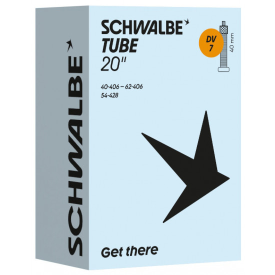 Schwalbe standard bicycle inner tube no. 7. For bicylce tires in 20" inch (ETRTO 40/62-406, 54-428). Retains air for an above-average length of time. Thanks to the best material quality and uniform wall thickness. Maximum reliability that has proven itself millions of times over.