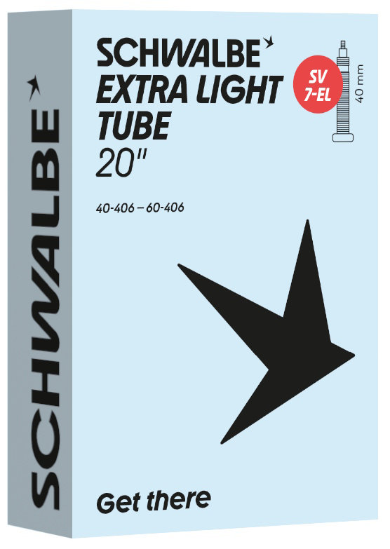 Schwalbe EXTRA LIGHT bicycle inner tube no. 7-EL. For bicylce tires in 20" inch (ETRTO 40/62-406). Lower weight, with the same reliability as a Schwalbe standard inner tube.