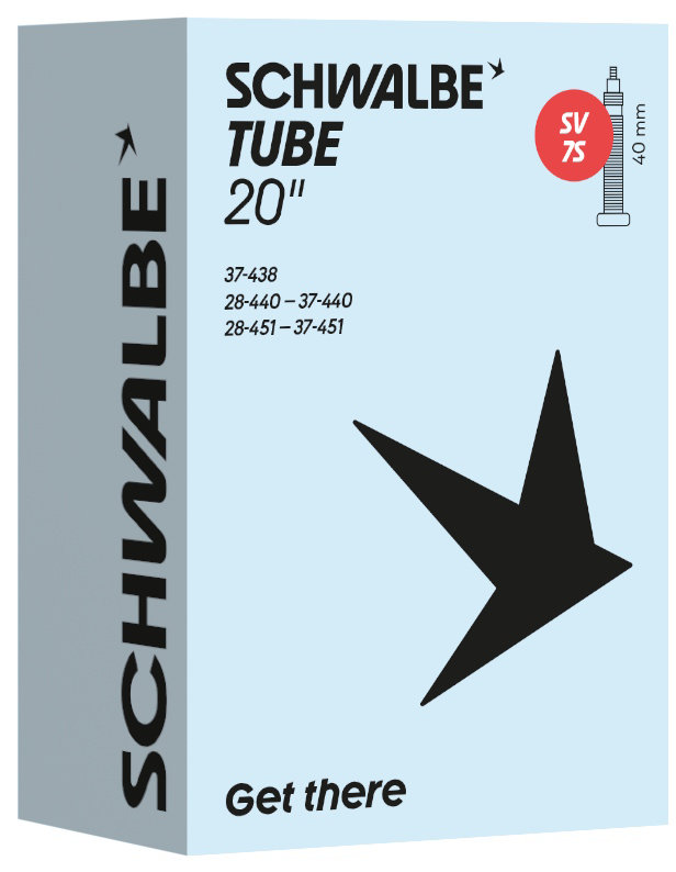 Schwalbe standard bicycle inner tube no. 7S. For bicylce tires in 20" inch (ETRTO 37-438, 28/37-440, 28/37-451). Retains air for an above-average length of time. Thanks to the best material quality and uniform wall thickness. Maximum reliability that has proven itself millions of times over.