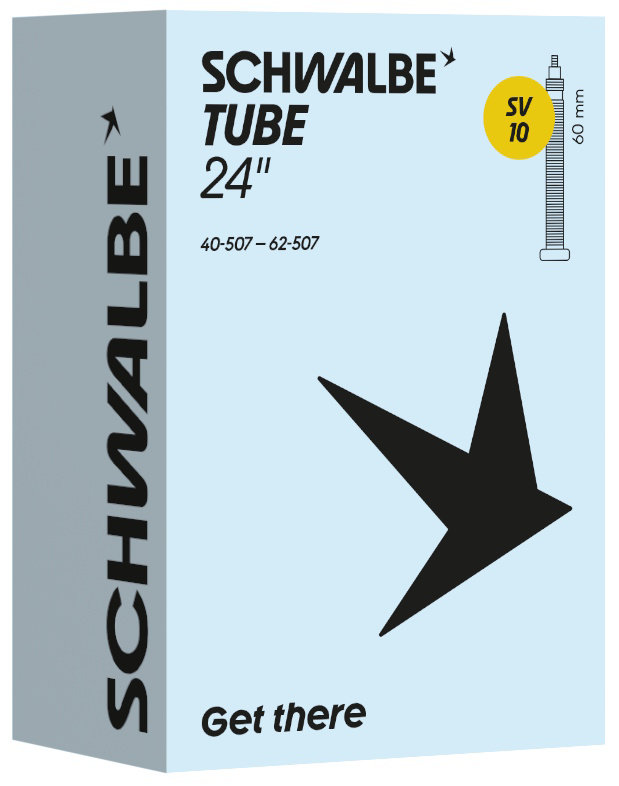 Schwalbe standard bicycle inner tube no. 10. For bicylce tires in 24" inch (ETRTO 40/62-507). Retains air for an above-average length of time. Thanks to the best material quality and uniform wall thickness. Maximum reliability that has proven itself millions of times over.
