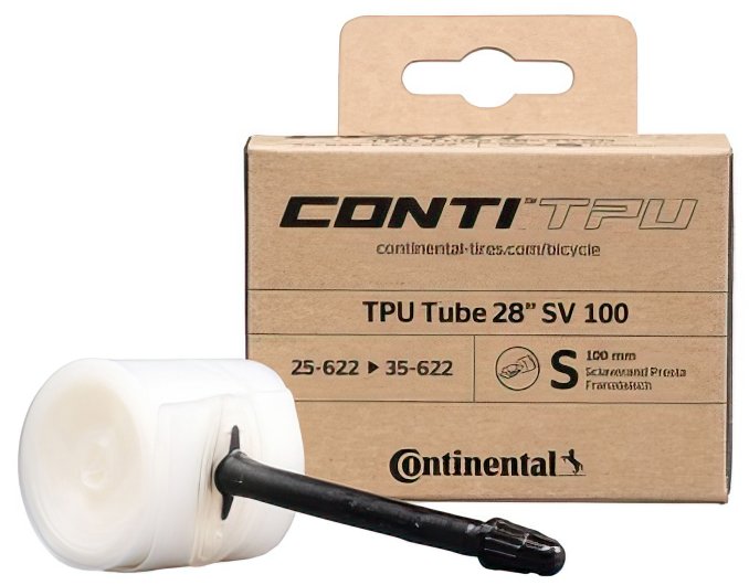 The seven-layer, lightweight and space-saving TPU tube from Continental for performance-oriented road riders. ContiTPU is premium, lightweight yet durable and suitable for both road and off-road riders. The highest grade of micrometer-thick TPU deployed across seven sealed layers maximises airtightness and durability. The tubes are uncoloured to further ensure the highest material quality and prevent air retention issues caused by dye-related surface imperfections. Every ContiTPU tube is quality-checked post-production. The base of the valve shaft is slightly conical in shape to improve fit to the wheel rim and reduce unwanted movement, while the valve is internally threaded to allow for the use of valve extensions or a replacement valve core.