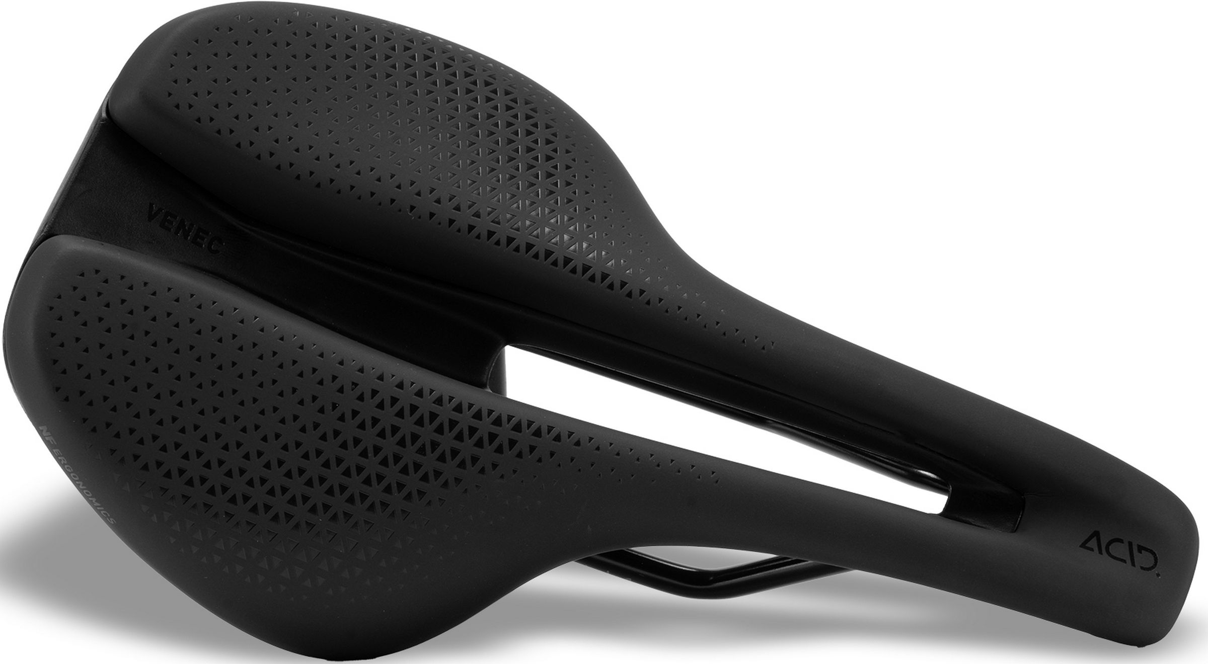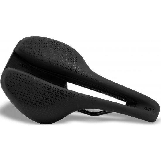 Introducing the acid venec saddle designed for enthusiastic cyclists who tackle steep climbs and tough descents with finesse. Engineered to optimize your riding experience, this saddle combines innovative design with unparalleled comfort for your alpine adventures. Featuring dual-foam padding, the acid venec offers a perfect balance of support and comfort. Specially formed support foam provides stability for your pelvis during pedaling, while a softer outer foam ensures outstanding comfort mile after mile. Designed to enhance your comfort, the ergo-relief channel with a central cutout alleviates pressure on the soft perineal tissue, ensuring a smooth and enjoyable ride. Meanwhile, shock absorber technology between the rail and seat absorbs shocks and vibrations from riding on gravel and rough surfaces, providing added comfort and control. The deep-shell design beneath the seat bones improves pressure distribution and supports natural pelvic movement while pedaling, enhancing your overall comfort and performance on the trail. Equipped with an integrated silink, attaching compatible accessories is quick and practical, allowing you to customize your setup for every biking adventure. Optimized for the bent forward position (b), the acid venec saddle offers a perfect blend of comfort and functionality, making it the ultimate choice for mountain bikers seeking top-tier performance on every track.
